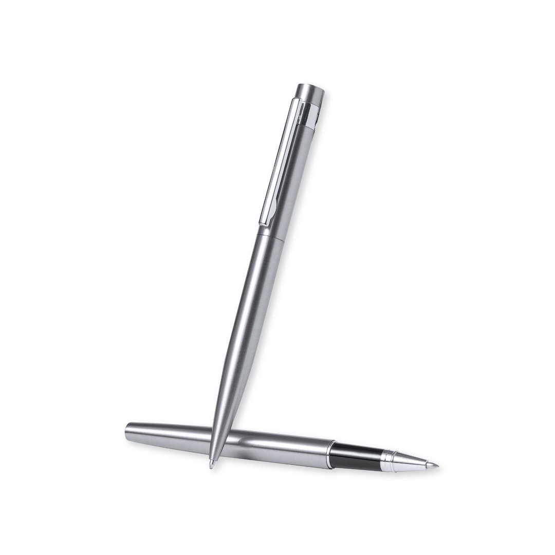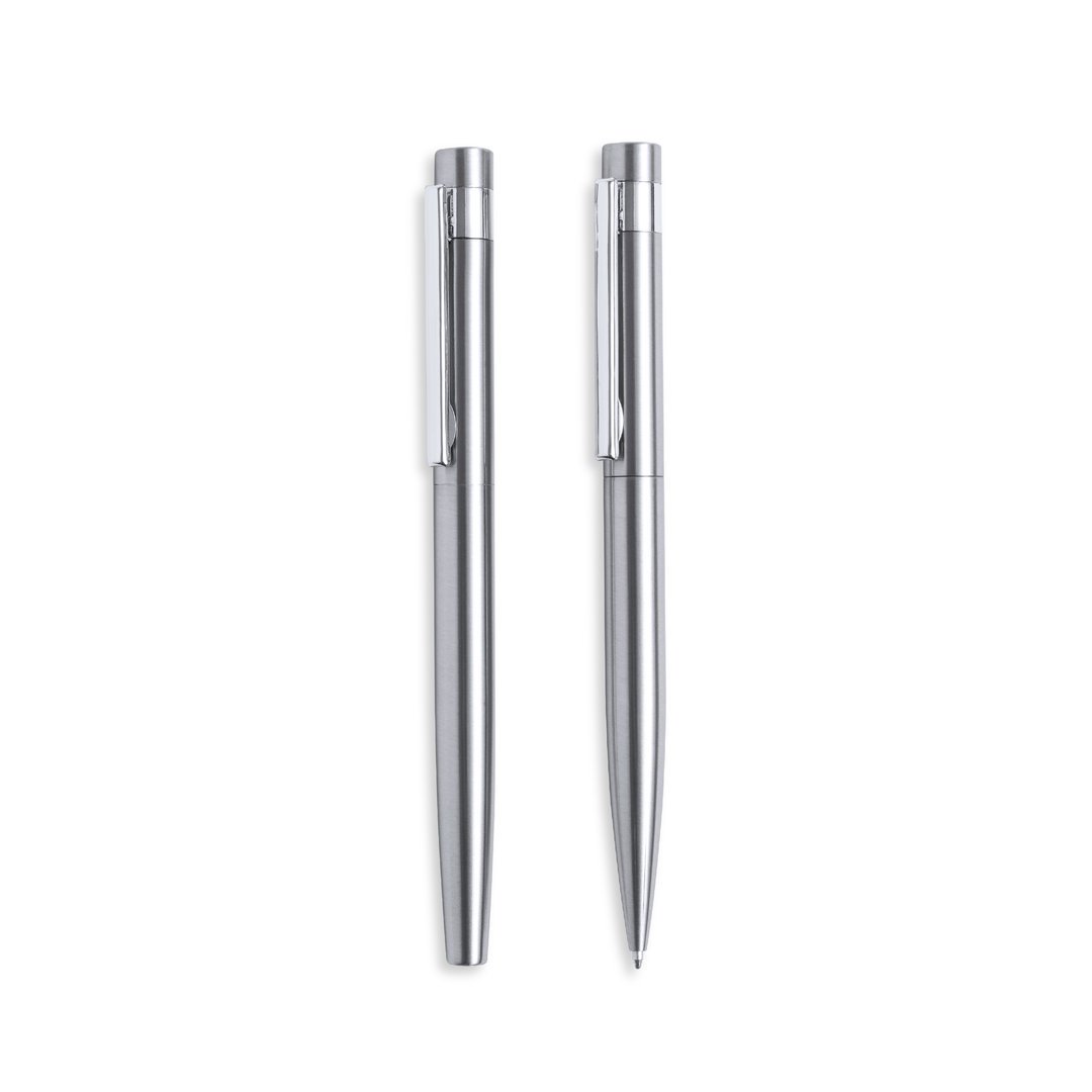 Ensemble écologique composé d’un stylo et d’un roller, en acier inoxydable recyclé. Comprend :Stylo bille à mécanisme rotatif, avec corps finition argent et accessoires chromés. Clip métallique et acier inoxydable recyclé distinctif sur le dessus du stylo. Cartouche Jumbo et encre bleue.Stylo roller avec corps argenté et accessoires chromés. Clip métallique et acier inoxydable recyclé distinctif en haut de la hotte. Cartouche Jumbo et encre bleue.Ensemble présenté dans un écrin design kraft individuel avec une housse assortie.L’acier est l’un des matériaux les plus demandés et peut être trouvé presque partout, des produits de tous les jours aux grandes constructions. Avec d’innombrables propriétés, y compris la durabilité et son haut degré de réutilisation, ce qui en fait une alternative très appréciée dans les solutions de durabilité. Correctement traité, il permet d’obtenir de nouvelles ressources d’utilisation infinie.