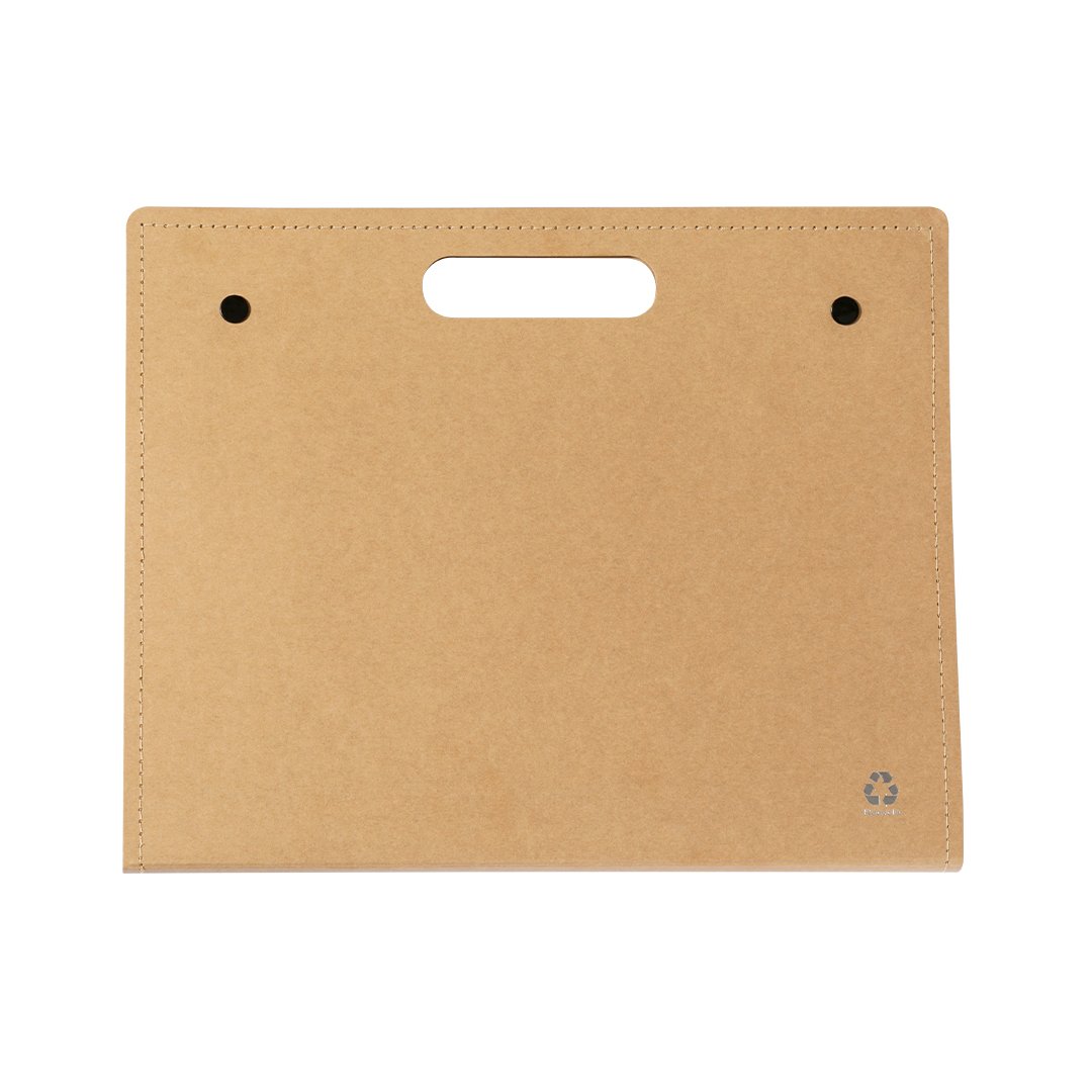 Conférencier écologique avec fermeture à double pressions en carton souple recyclé, avec poignées intégrées pratiques. Intérieur avec bloc amovible de 25 feuilles lignées, 25 grands feuillets adhésifs, 125 marque-pages adhésifs, une poche à rabat et un porte-stylo à bille.