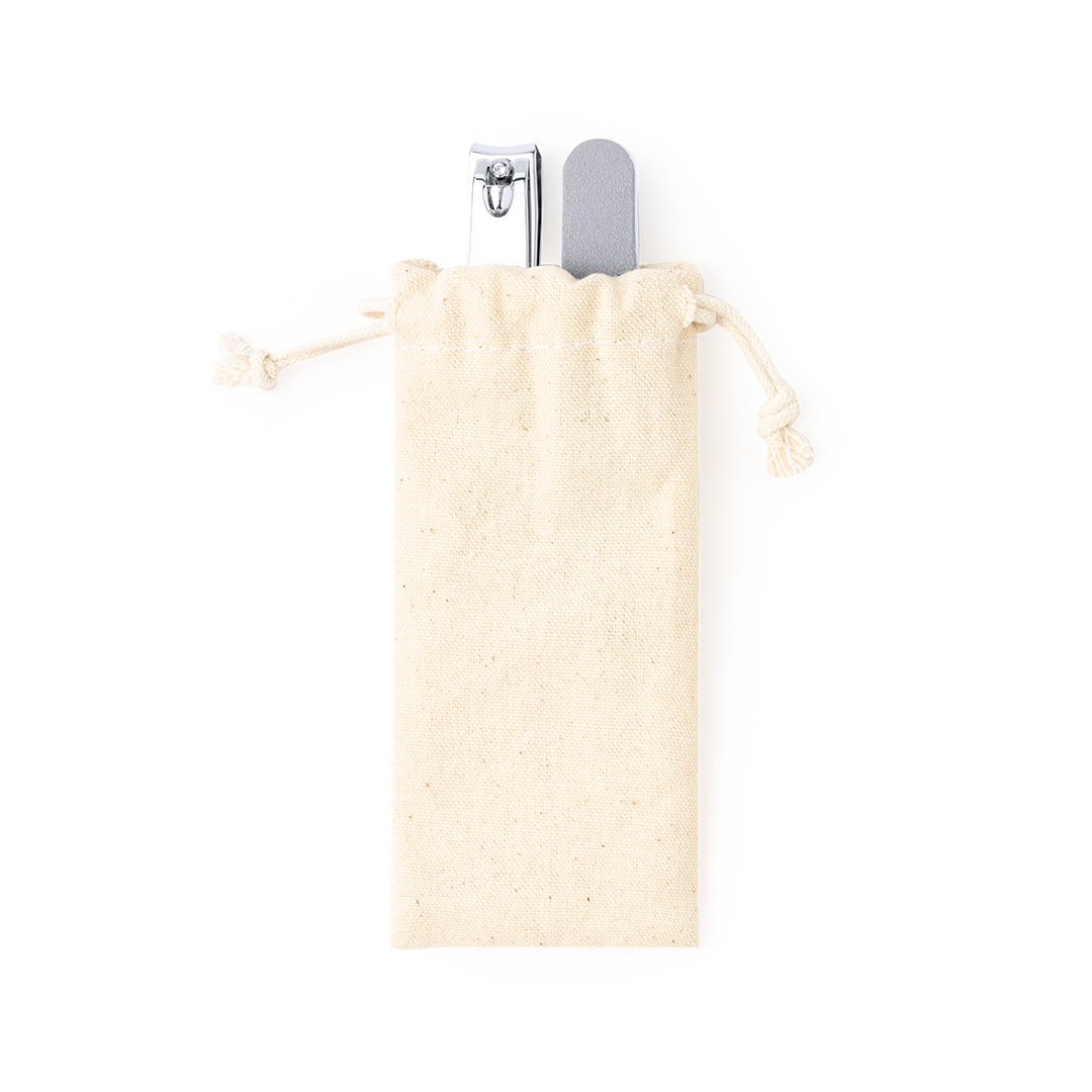 Ensemble de manucure avec coupe-ongles et lime. Présenté dans un sac individuel en coton écru avec fermeture à cordon.