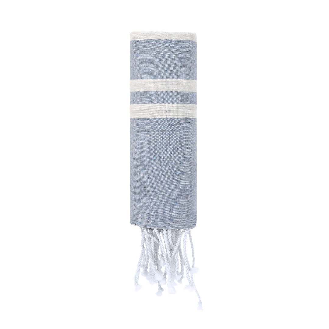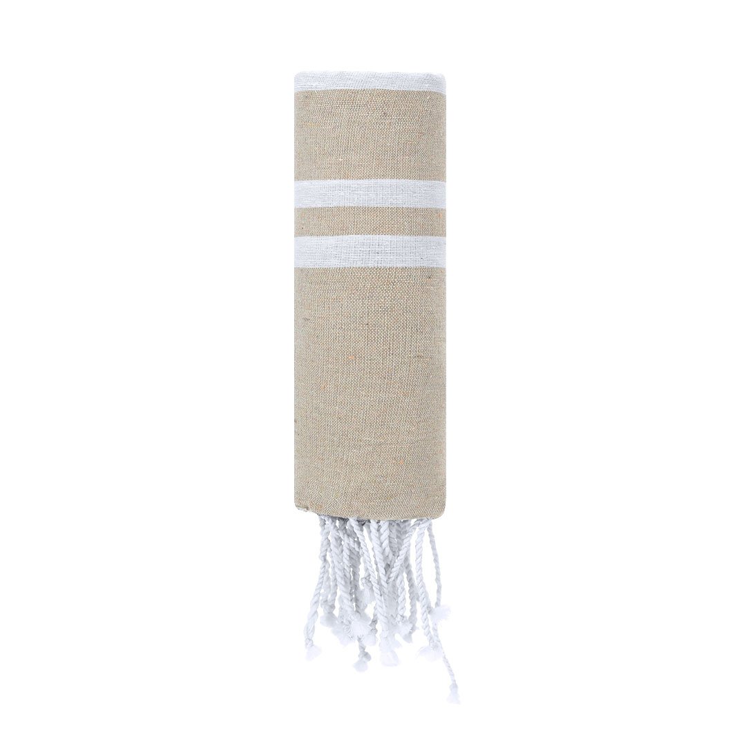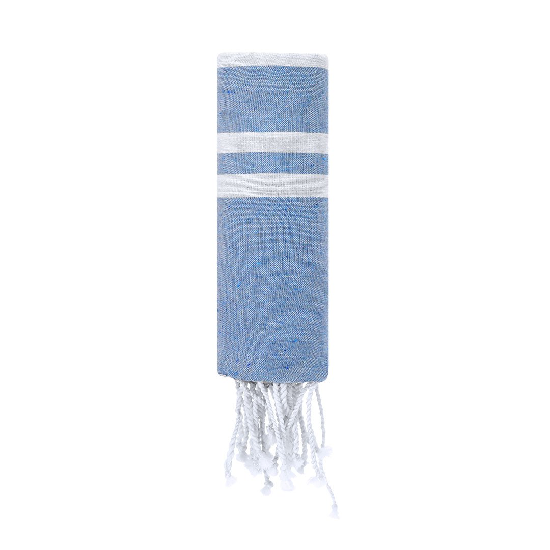 Pareo-serviette doux de 150g/m2 en combinaison de coton et polyester. Son design présente une base en couleur et des rayures blanches. Inclut des franges aux extrémités qui ajoutent un détail décoratif et complètent sa finition.