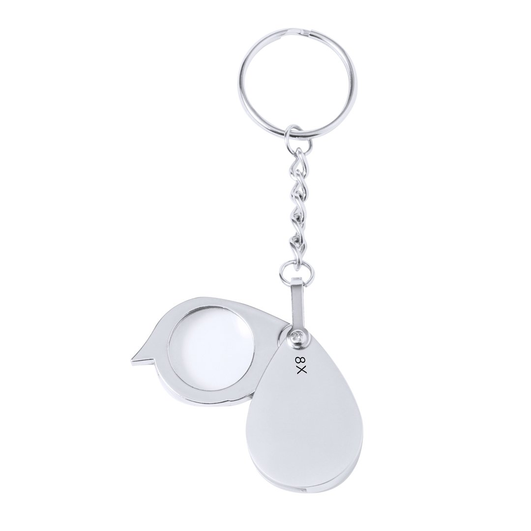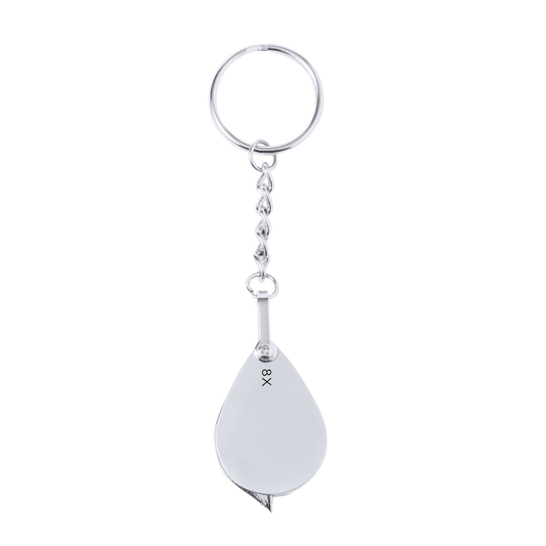 Pratique porte-clés loupe pliable, grossissant 8x et fabriqué en métal résistant. Facile à transporter en raison de sa petite taille et présenté dans une boîte en carton noir.