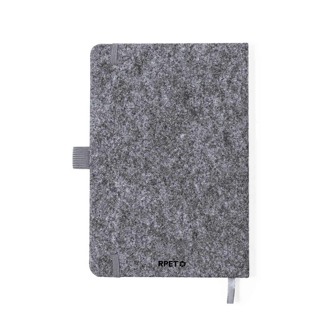 Bloc-notes avec support de couvertures rigides en feutre RPET 300D. Avec support original pour smartphone et tablette intégré dans la couverture, en bambou. Comprend fermeture élastique et support pour stylo assorti, avec 80 feuilles intérieures à lignes. Avec logo RPET Logo à l’arrière et présenté dans un sac individuel recyclé.Le feutre RPET est le fruit de la combinaison du processus de recyclage des matières plastiques et de la technique millénaire de fabrication du feutre, ce qui donne un matériau éco-tendance qui, en plus d’être d’origine recyclée, devient également recyclable.