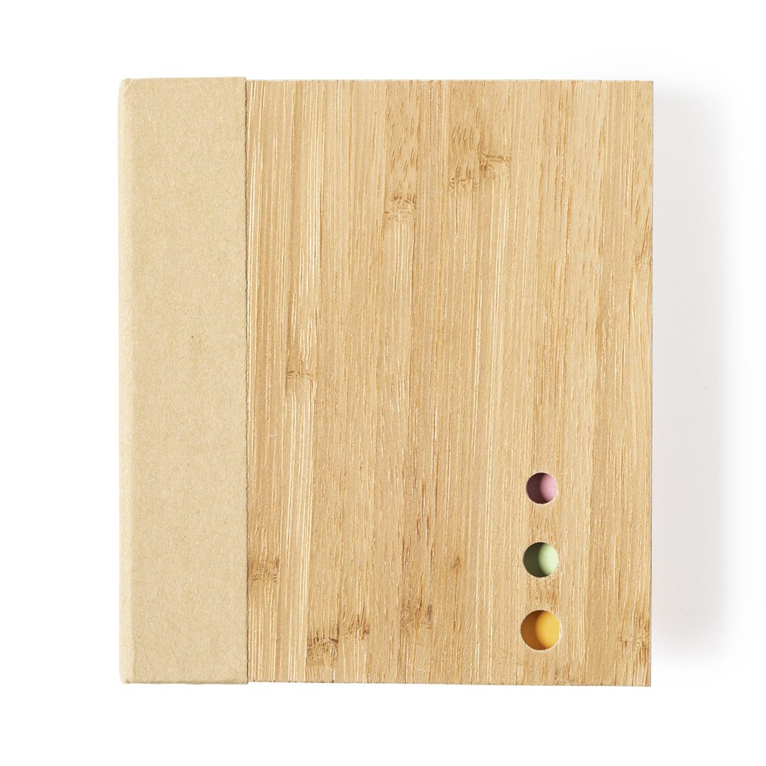 Porte-note de la ligne Nature avec couvercles rigides en bambou. Avec 115 feuilles adhésives kraft, 115 feuilles adhésives moyennes et 420 mini-notes autocollantes.