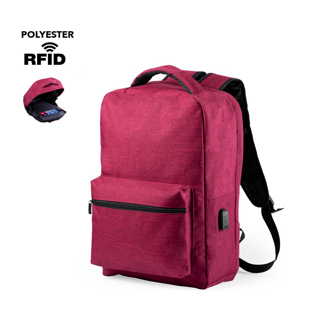 Sac à dos antivol en polyester durable 300D. Avec poche antivol sur le dos pour stocker des objets de valeur. Compartiment intérieur avec sortie USB pour la connexion powerbank -non inclus.. Inclut le micro câble USB pour une commodité totale dans le chargement de n importe quel appareil mobile. Poche latérale avec protection RFID et compartiments intérieurs rembourrés pour tablettes jusqu à 10 pouces et ordinateurs portables jusqu à 15 pouces. Tape pour fixer au chariot et disponible dans une large gamme de couleurs, avec une multitude de poches intérieures et extérieures. Sangles d épaule et de dos réglables avec rembourrage.