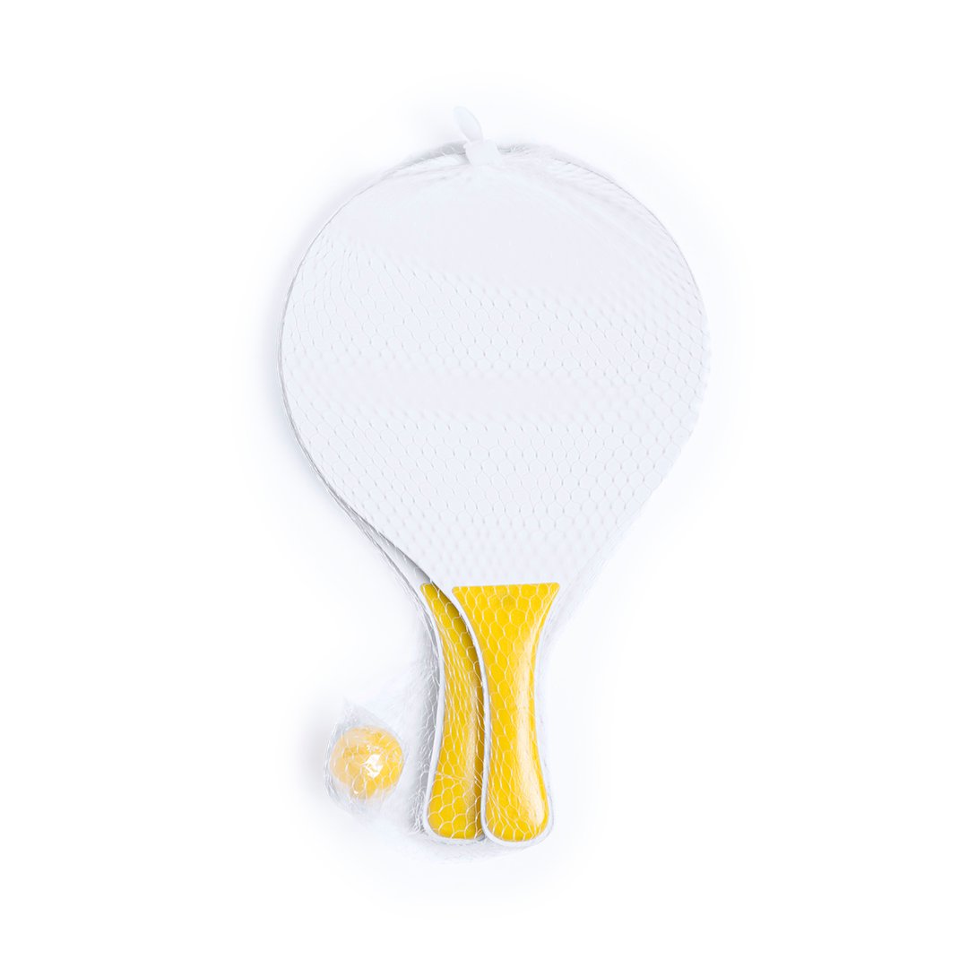 Set de raquette de plage en bois. Avec poignées renforcées, existe dans une large gamme de couleurs vives. Présenté dans un filet avec balle assortie.