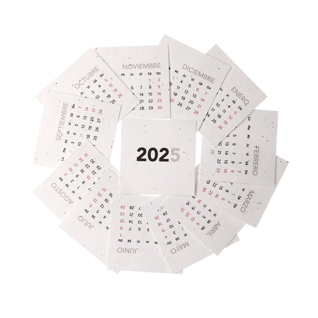 Calendrier plantable en papier de semences. Comprend 13 feuilles avec des graines de pétunia de différentes couleurs, transformant le papier en papier plantable après sa durée de vie. Design du mois en cours, avec les jours fériés nationaux marqués en rouge et les jours fériés régionaux en vert. Présenté dans une boîte de support en carton.