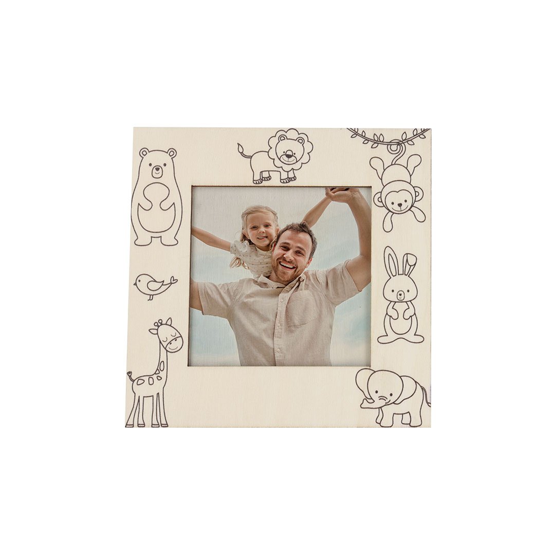 Cadre photo fabriqué en bois naturel avec design d’animaux. Inclut des crayons de couleur pour personnaliser et décorer le cadre. Conçu pour des photographies de 7,5×7,5 cm. Dispose d’un support arrière pratique à charnière.