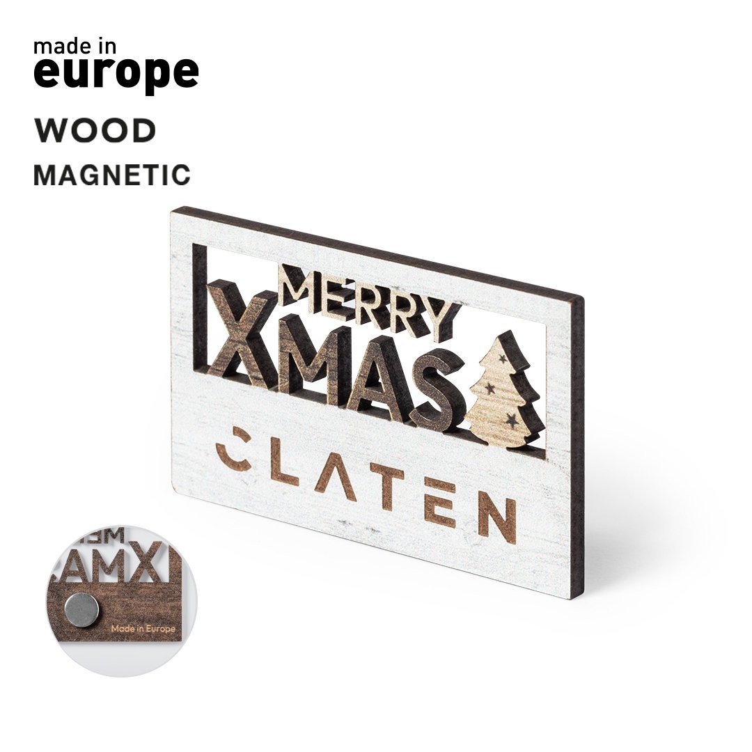 Aimant original Merry Christmas en bois naturel, avec texte découpé et une finition bicolore originale. Grande surface de marquage et caractéristique Made In Europe.