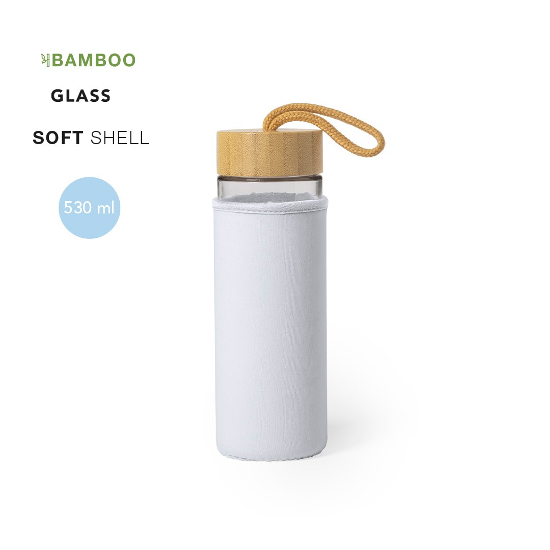Gourde en verre et bambou de la collection gamme éco-friendly. Bouteille d’une capacité 530 ml, avec bouchon à vis en bambou et étui en néoprène blanc. Anse de transport en couleur naturel camel, présentée dans une boîte éco design.Manuel d’instructions disponible en espagnol et en anglais.