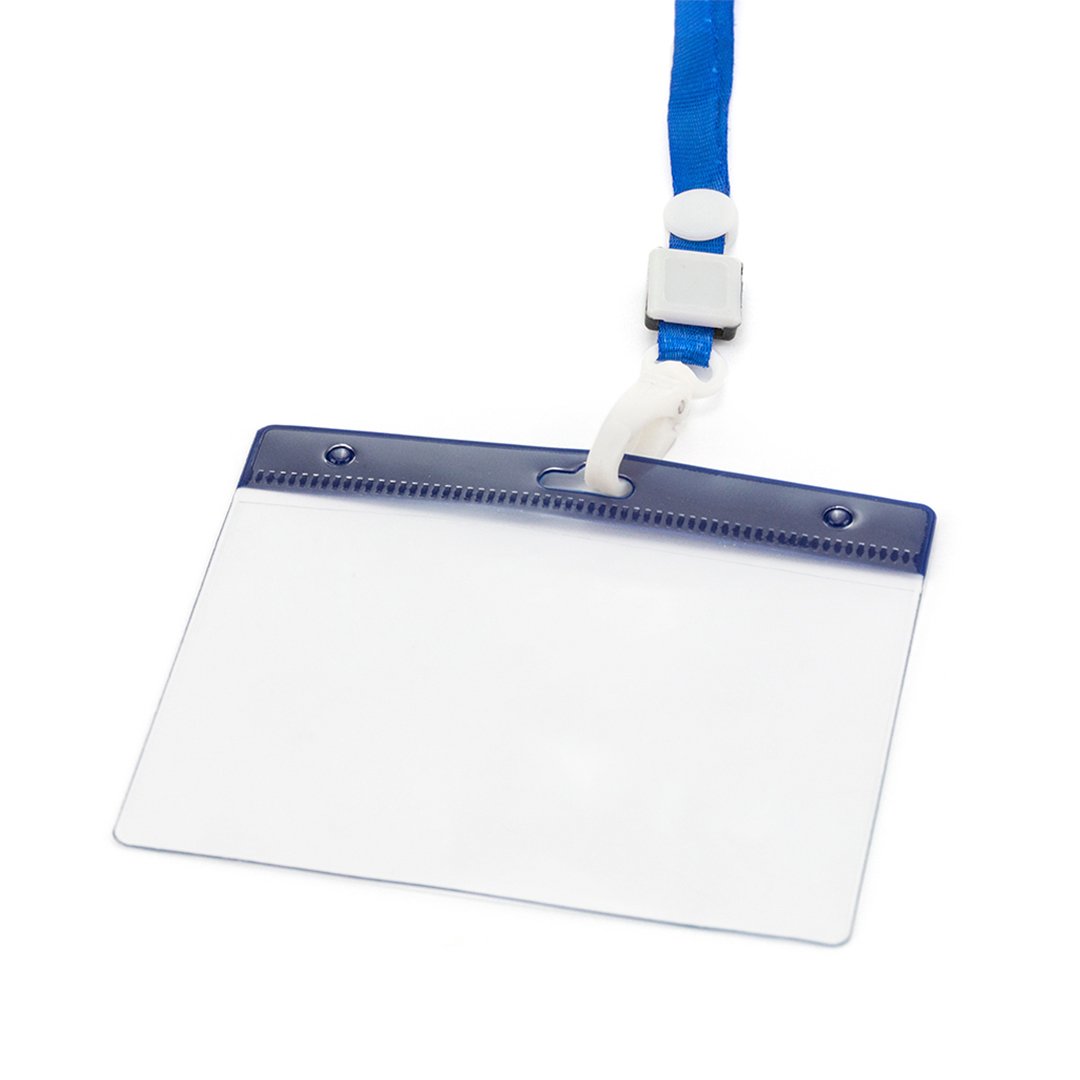Badge en PVC avec lanyard assorti dans des couleurs vives avec fermeture par mousqueton. Pastille ronde pour marquage