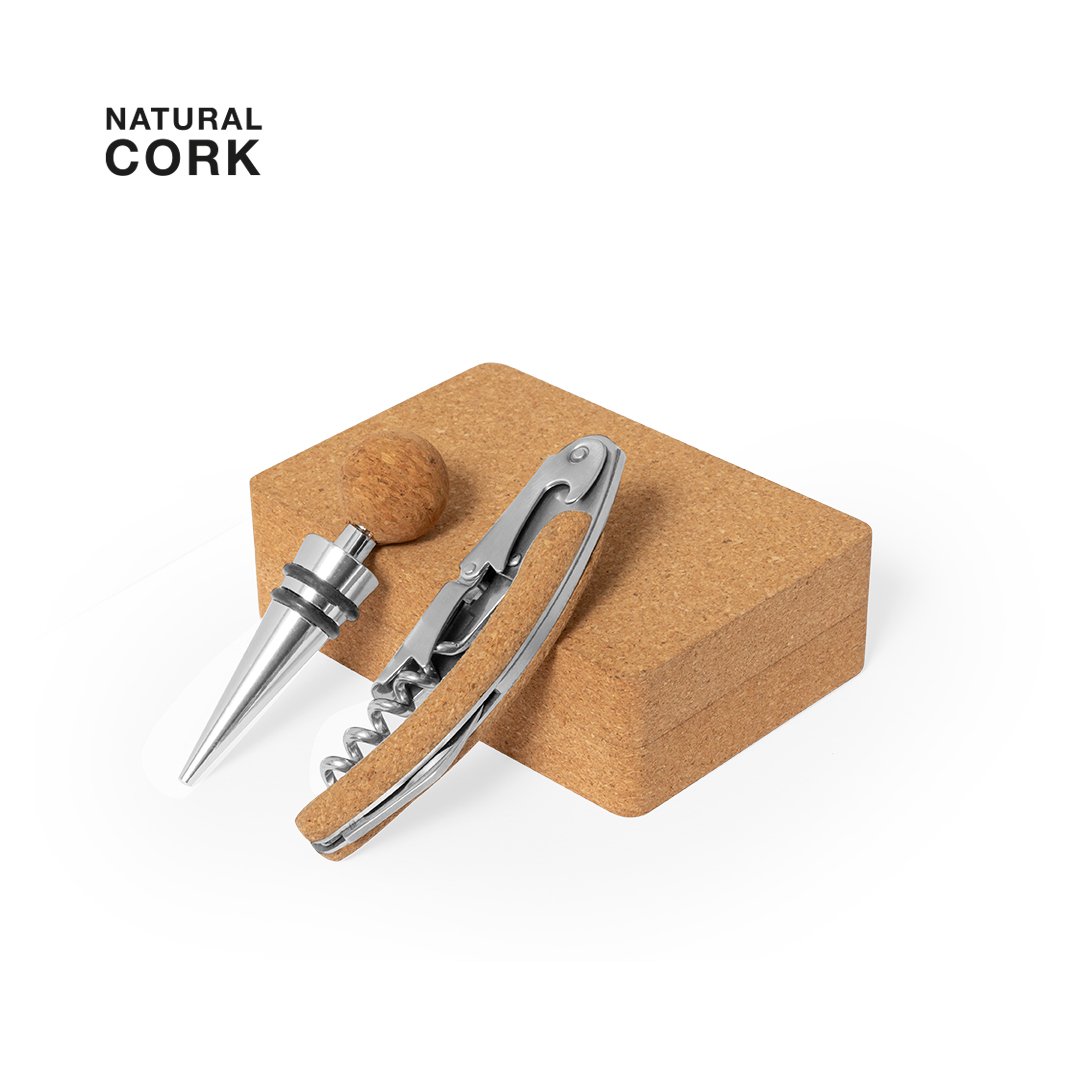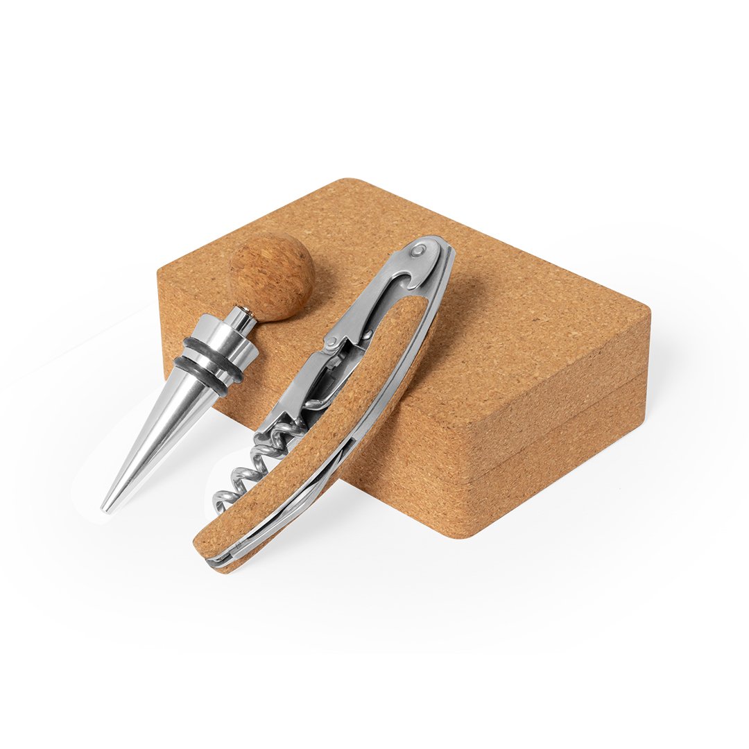 Set de vins fini en liège. Accessoires en acier inox. Comprend tire-bouchon à deux temps et bouchon. Présenté dans un étui en liège, avec intérieur découpé et fixation avec aimants.Élaboré à partir d’éléments végétaux pour encourager l’utilisation de matières premières naturelles et réduire les émissions polluantes.