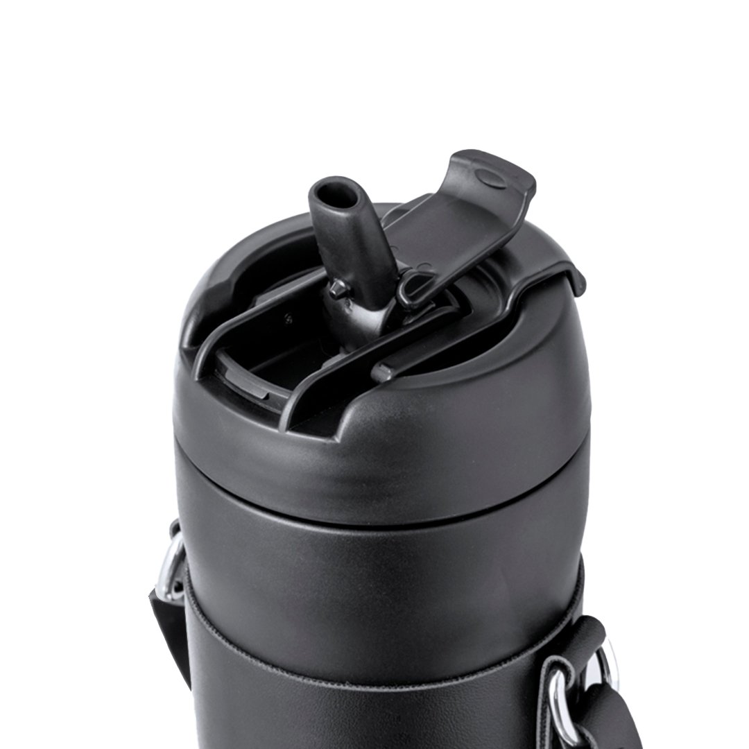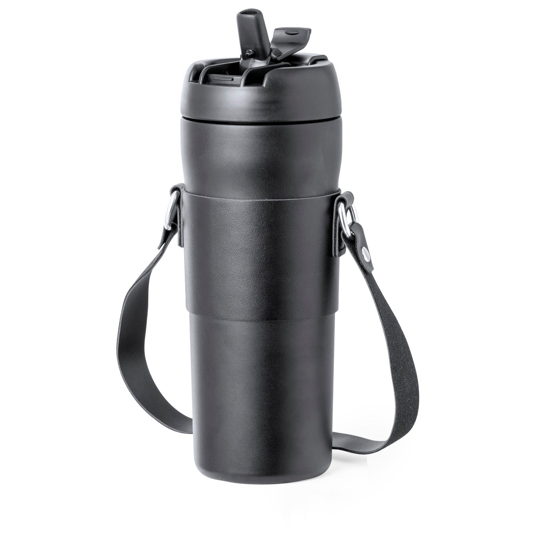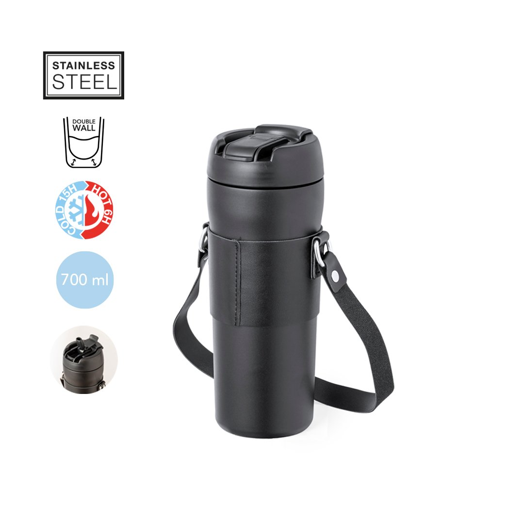 Élégant bidon thermique de 700 ml de capacité, fabriqué en acier inox à double paroi. Bouchon à vis original avec doseur sur le capuchon et embout pour paille, inclus. Avec poignée de transport et pince assortie en éco-cuir. Présenté dans une boîte individuelle de conception kraft.