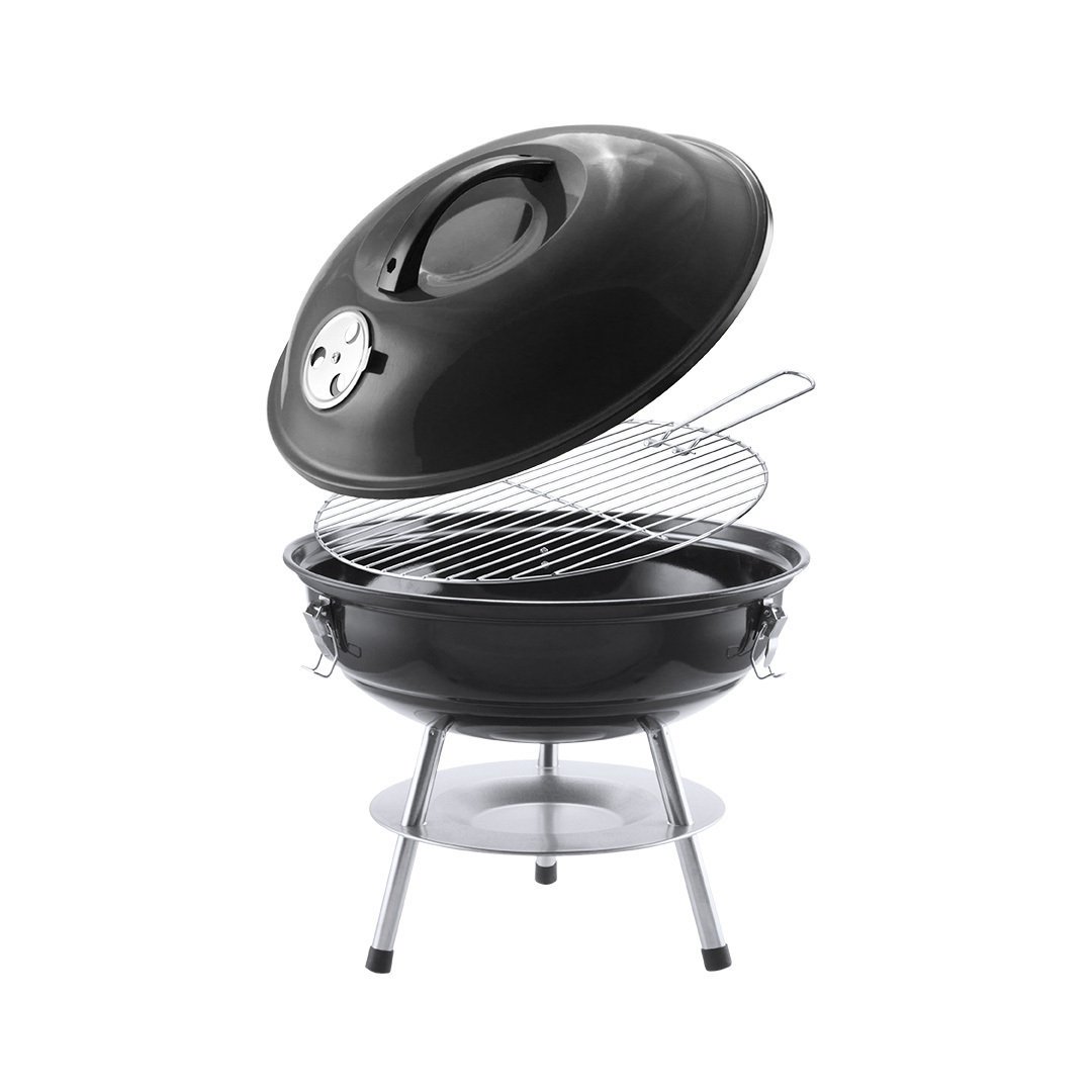 Barbecue en acier au carbone résistant en noir. Couvercle avec poignée confortable et trous de ventilation, avec grille métallique, plaque anti-goutte et pieds antidérapants. Présenté dans une boîte de design attrayante.