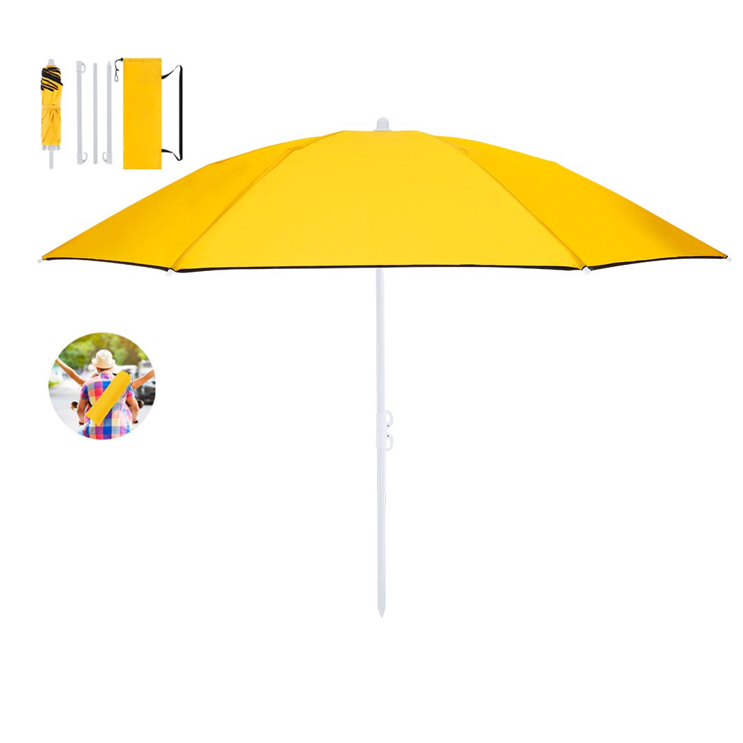 Parasol de plage pliable à 8 panneaux dont le design compact en quatre sections facilite le montage. Fabriqué en nylon résistant avec intérieur gris argenté et protection UV, d’un diamètre de 160 cm, hauteur ajustable et tubes métallisés en blanc. Les baleines sont fabriquées en fibre de verre pour une plus grande résistance et résistance au vent. Se présente dans un sac transparent pratique assorti au parasol, avec fermeture à cordon et sangle pour le transport.