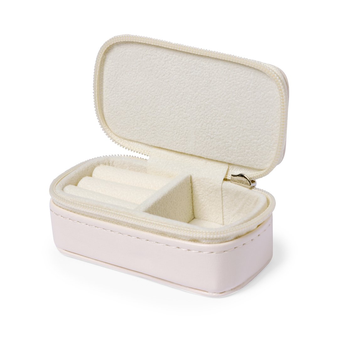 Boîte à bijoux en éco-cuir. Design de couleur naturelle avec fermeture à glissière et deux compartiments à l’intérieur. Un compartiment en forme de petite boîte et un compartiment avec des coussinets pour attacher les bagues et les boucles d’oreilles, doublé de tissu doux. Présenté dans un sac en papier individuel.