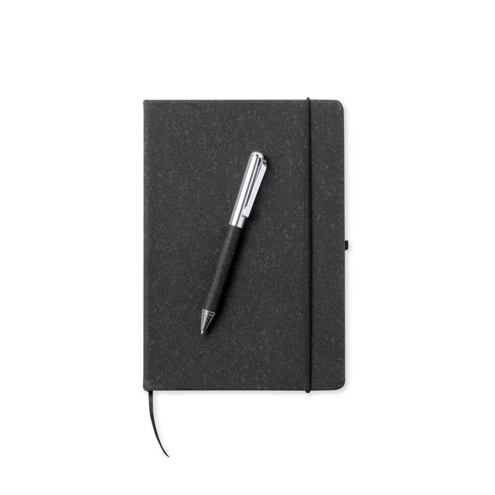 Ensemble bloc-notes et stylo en cuir recyclé. Comprend :Bloc-notes avec couvertures rigides en cuir recyclé. Intérieur avec 100 feuilles disposées en ligne. Comprend un signet, une fermeture élastique et un porte-stylo assorti. Avec du cuir recyclé distinctif sur la couverture arrière.Stylo bille en métal chromé et corps recouvert de cuir recyclé. Clip métallique élégant et accessoires assortis. Avec un mécanisme rotatif et à l’encre bleue, avec cuir recyclé distinctif sur le corps.Ensemble présenté dans un écrin design kraft individuel, avec un compartiment séparé pour un bloc-notes et un stylo.Le cuir recyclé récupère les fibres rejetées dans les processus de fabrication du cuir, minimisant les déchets de matériaux, aidant à réduire l’impact environnemental tout en conservant ses propriétés d’origine.