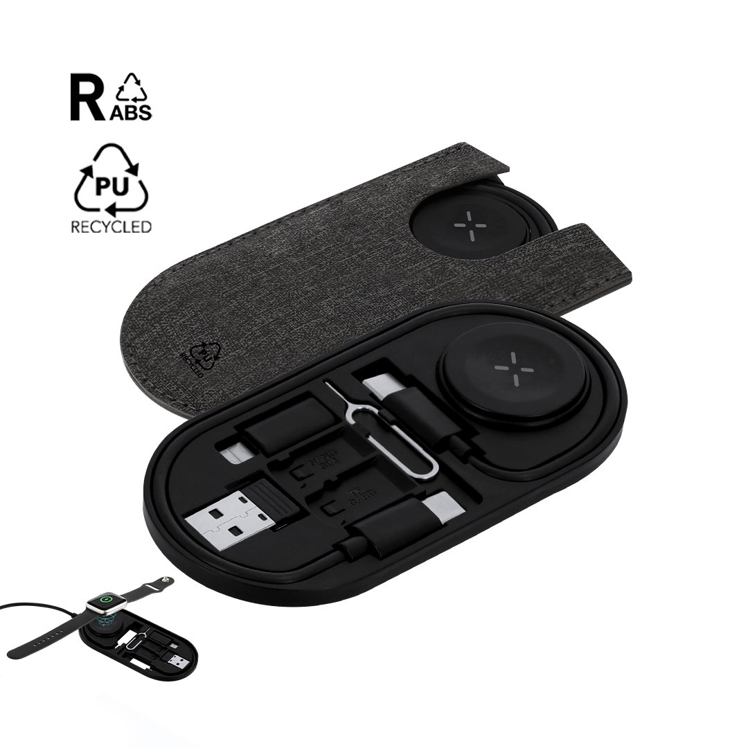 Set de câbles de charge en ABS recyclé (RABS). Inclut :- Charge sans fil pour smartwatch.- Câble multifonction avec têtes USB, Type-C et Lightning, compatible avec une large variété de dispositifs et avec capacité de transfert de données.- Outil d’éjection de SIM, avec des fentes pour le stockage de Nano SIM et de cartes TF.Le RABS est un plastique hautement recyclable d’une grande résistance et avec de nombreuses applications qui en font une solution écologique. Avec certification RCS, garantissant l’origine recyclée de celui-ci et avec logo RABS gravé.