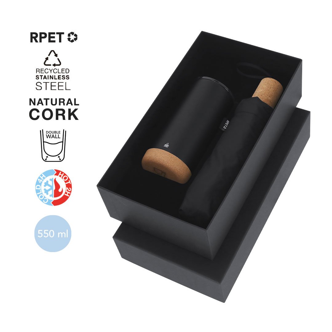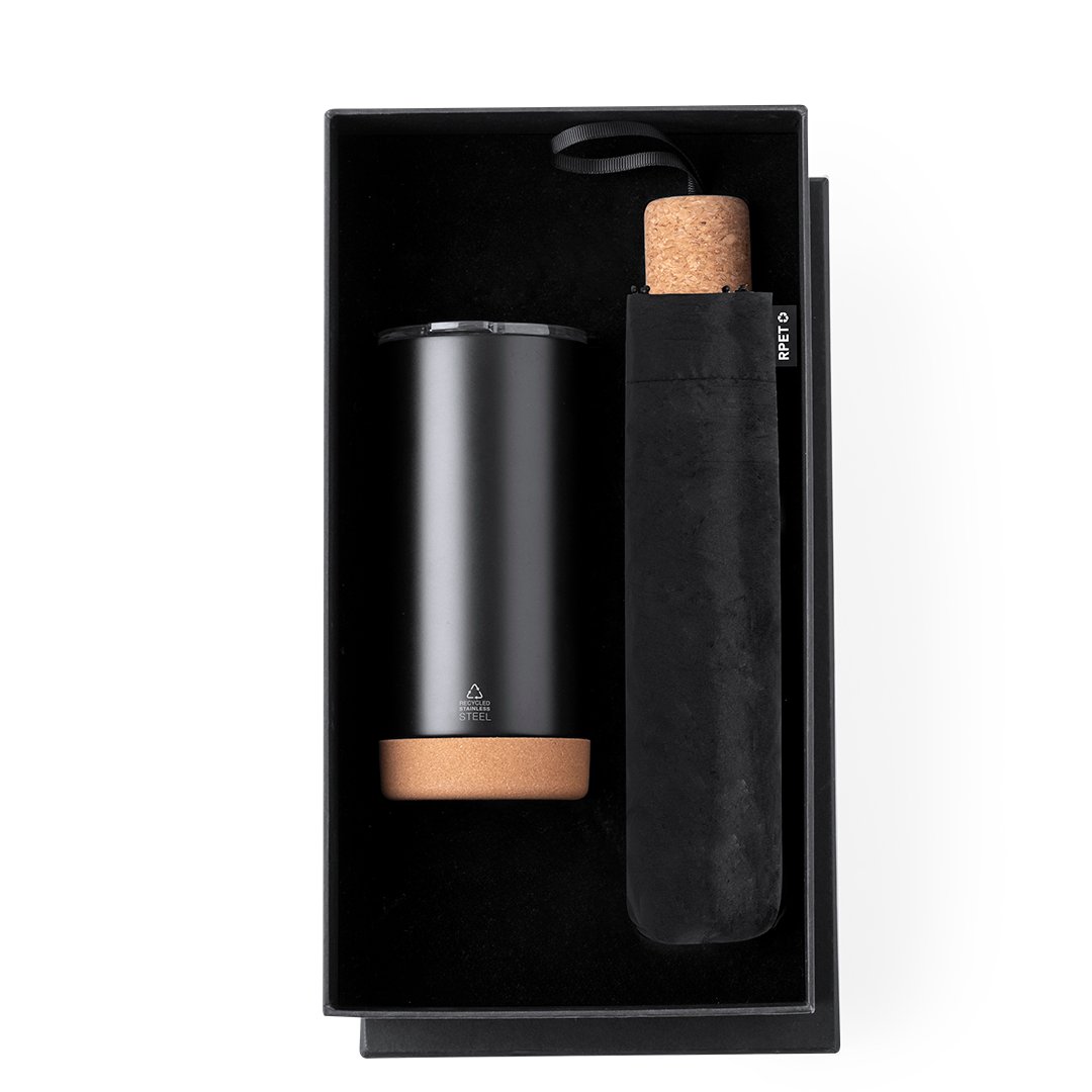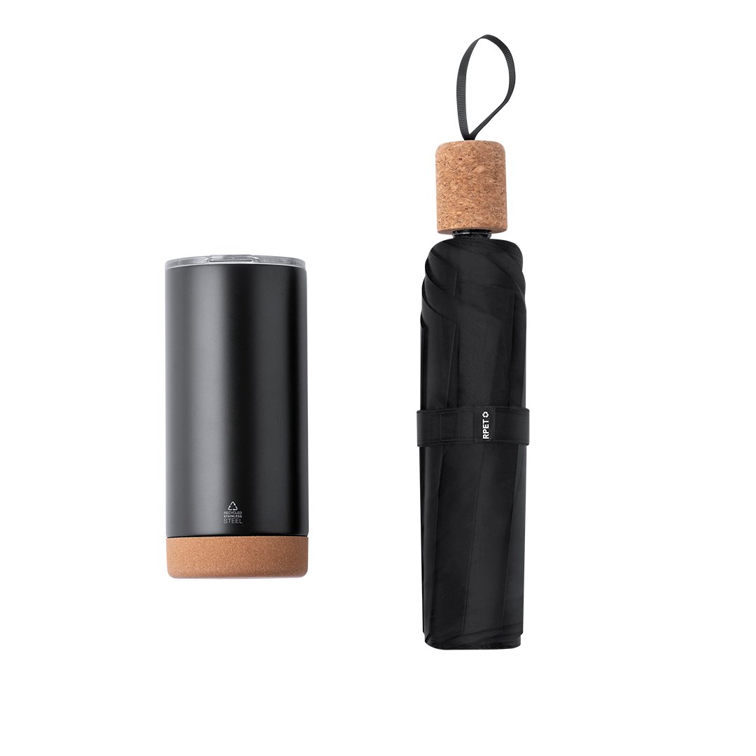 Set premium élégant comprenant : Gobelet thermique à double paroi en acier inox recyclé et 550 ml de capacité, avec finition noir mat élégante. Socle en liège, avec couvercle pressurisé et doseur. Il est idéal pour votre bureau, table ou toute autre surface où vous pouvez tranquillement savourer votre boisson préférée. Parapluie pliant noir de 98cm de diamètre. En matériau, mettez 190T RPET et manche en liège. Ouverture manuelle, avec système anti-vent et tiges en fibre de verre. Balise RPET distinctive. Set présenté en étui individuel de finition mat, avec découpage intérieur pour chacun des éléments du set. Le matériau RPET est fabriqué à partir de plastique recyclé, ce qui encourage la réutilisation des déchets plastiques et contribue à la durabilité de la planète.
