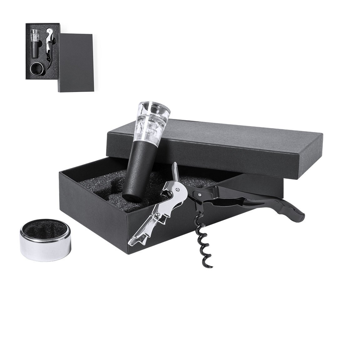 Complet set de vin à la finition noire sobre, présenté dans un étui individuel avec intérieur en mousse découpée et housse de protection blanche. Inclus un bouchon anti-goutte, un tire-bouchon en acier inoxydable et un bouchon de pompe à vide.