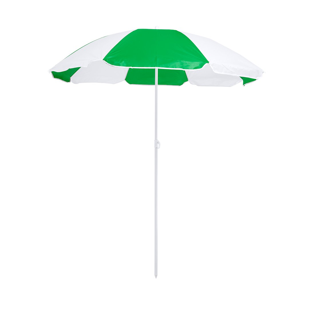 Parasol de plage de 8 panneaux en nylon résistant et bicolore. 150cm de diamètre, avec des jupes latérales et des tubes de couleur blanche recouverts de métal. Réglable en hauteur et présenté dans une housse en PVC avec bandoulière. Disponible dans une large gamme de couleurs.