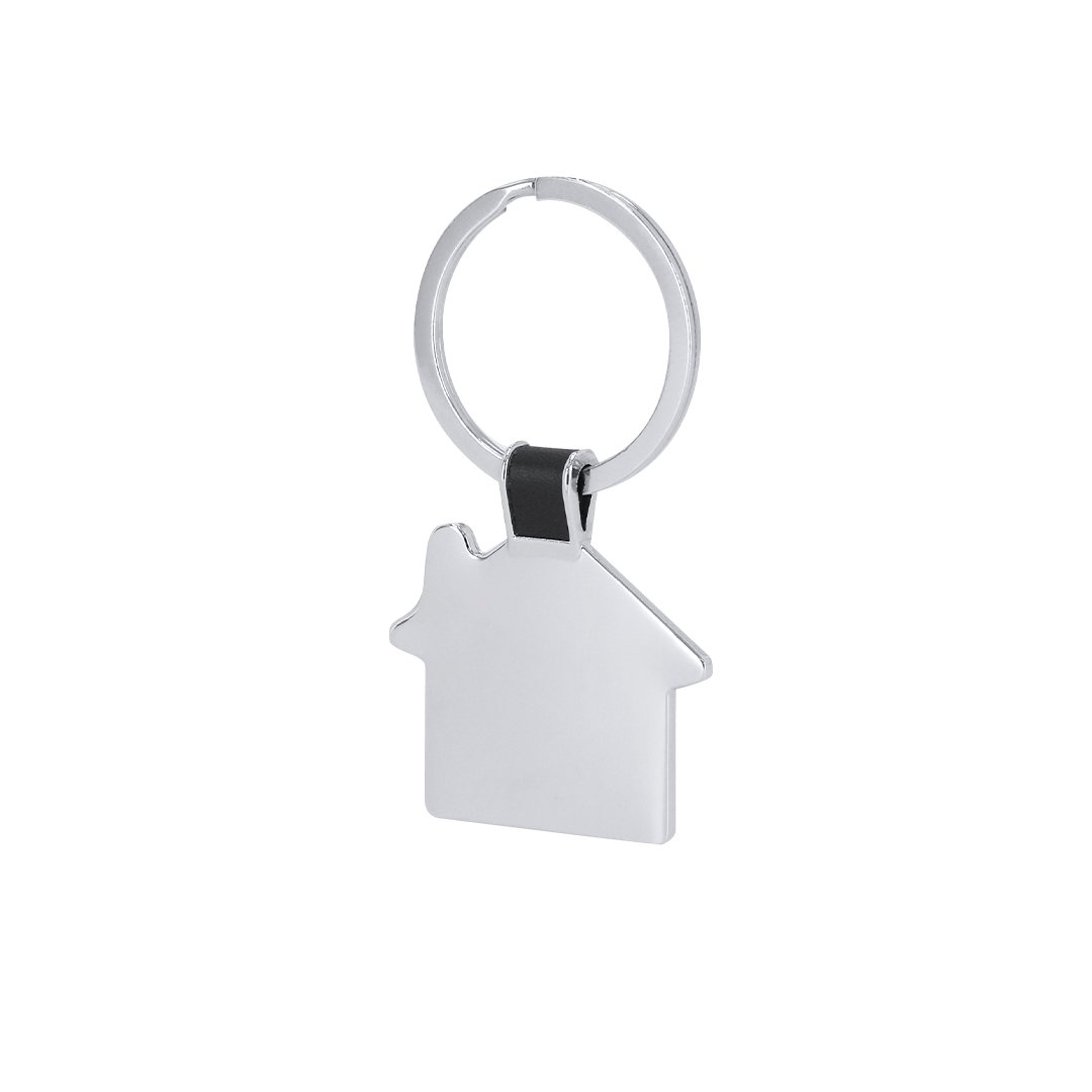 Porte-clés en métal avec design maison et détail en couleur noire.