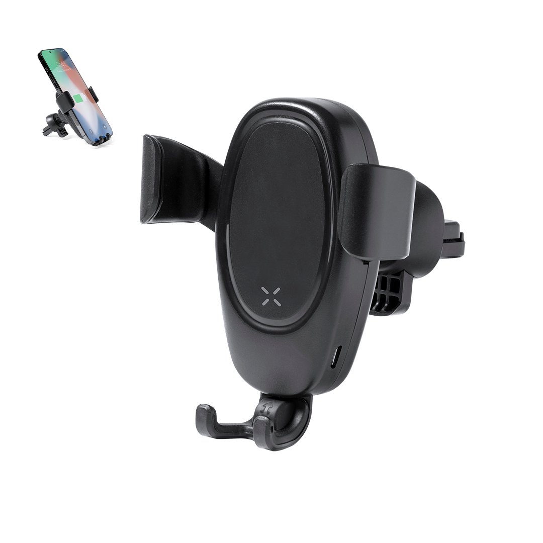 Support de voiture pour smartphone avec chargeur sans fil 10W intégré. Mécanisme de réglage automatique universel pour pouvoir utiliser l’appareil pendant qu’il est en charge. Compatible avec les appareils équipés de la technologie de charge sans fil. Présenté dans une jolie boîte au design individuel.
