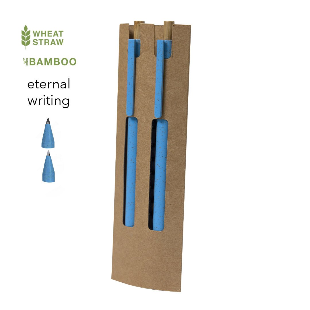 Set de stylo et crayon éternel fabriqués en paille de blé et bambou. Stylo avec mécanisme à bouton fabriqué en bambou avec encre bleue et clip assorti. Et crayon avec mécanisme à bouton fabriqué en bambou avec pointe éternelle, afin d’utiliser toujours le même crayon et de ne pas générer de déchets. Présentés dans un étui en carton recyclé. Avec marque de paille de blé imprimée.Fabriqué avec des éléments végétaux pour encourager l’utilisation de matières premières naturelles et réduire les émissions polluantes.