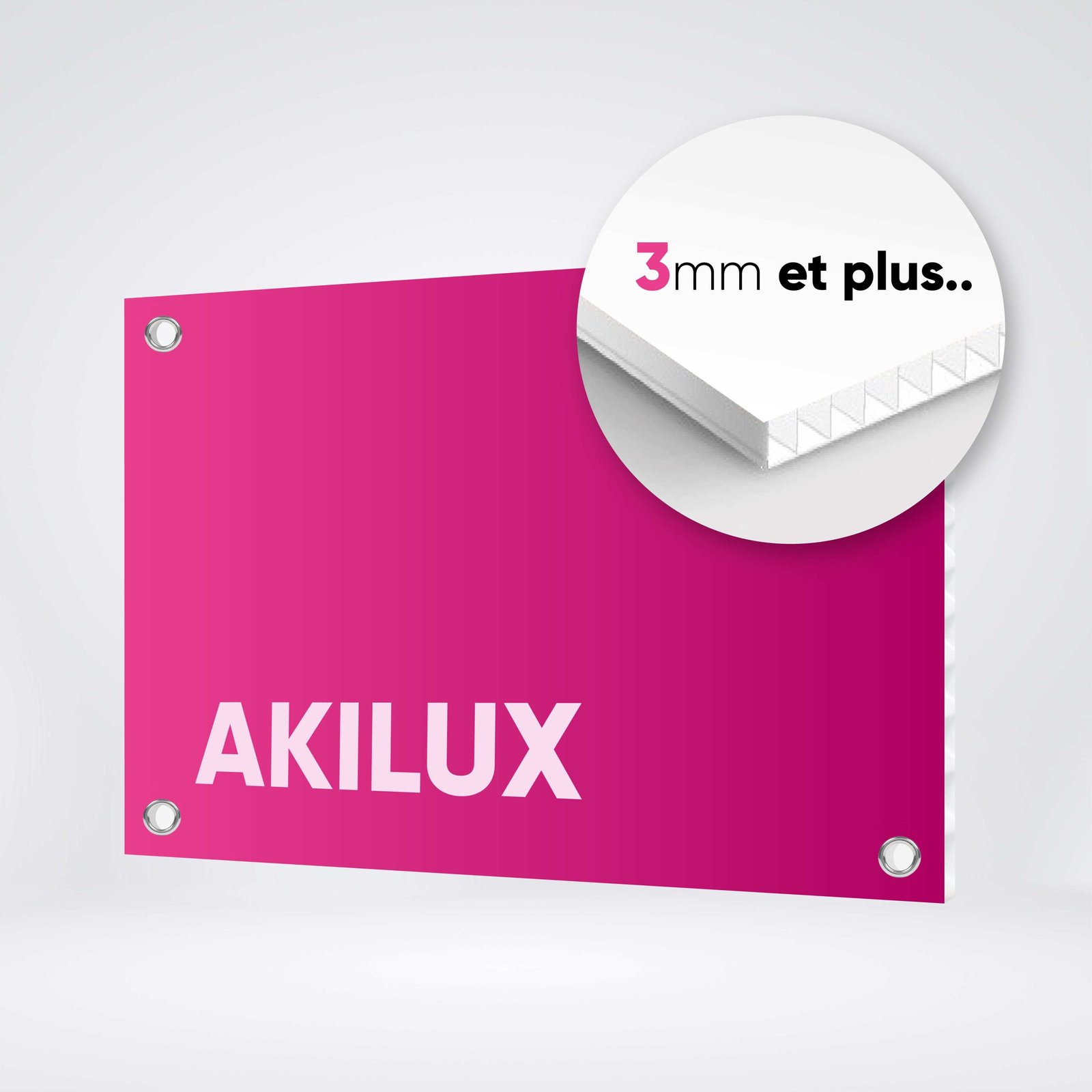 Les panneaux en polypropylène alvéolaire, également désignés sous le nom de panneaux Akilux ou Correx, sont le moyen idéal pour accroître la notoriété de votre marque et attirer le regard des passants ! Ces panneaux sont fréquemment utilisés par les agences immobilières et les commerces. Ils sont faits de plastique ondulé, doté de cannelures verticales ou horizontales, et d’une épaisseur de 3 mm, ce qui vous permet de les plier ou de les courber. Ce matériau, solide, durable et entièrement recyclable et résistant à l’eau, est idéal pour une utilisation en intérieur ou en extérieur. Personnalisez-le à votre guise et boostez votre visibilité grâce à Secretprint ! Nous vous proposons également différentes épaisseurs supplémentaires pour satisfaire tous vos besoins !Impression UV de haute qualité / Impression recto ou recto-verso identiques / Imperméable / Conçu pour une utilisation à court terme