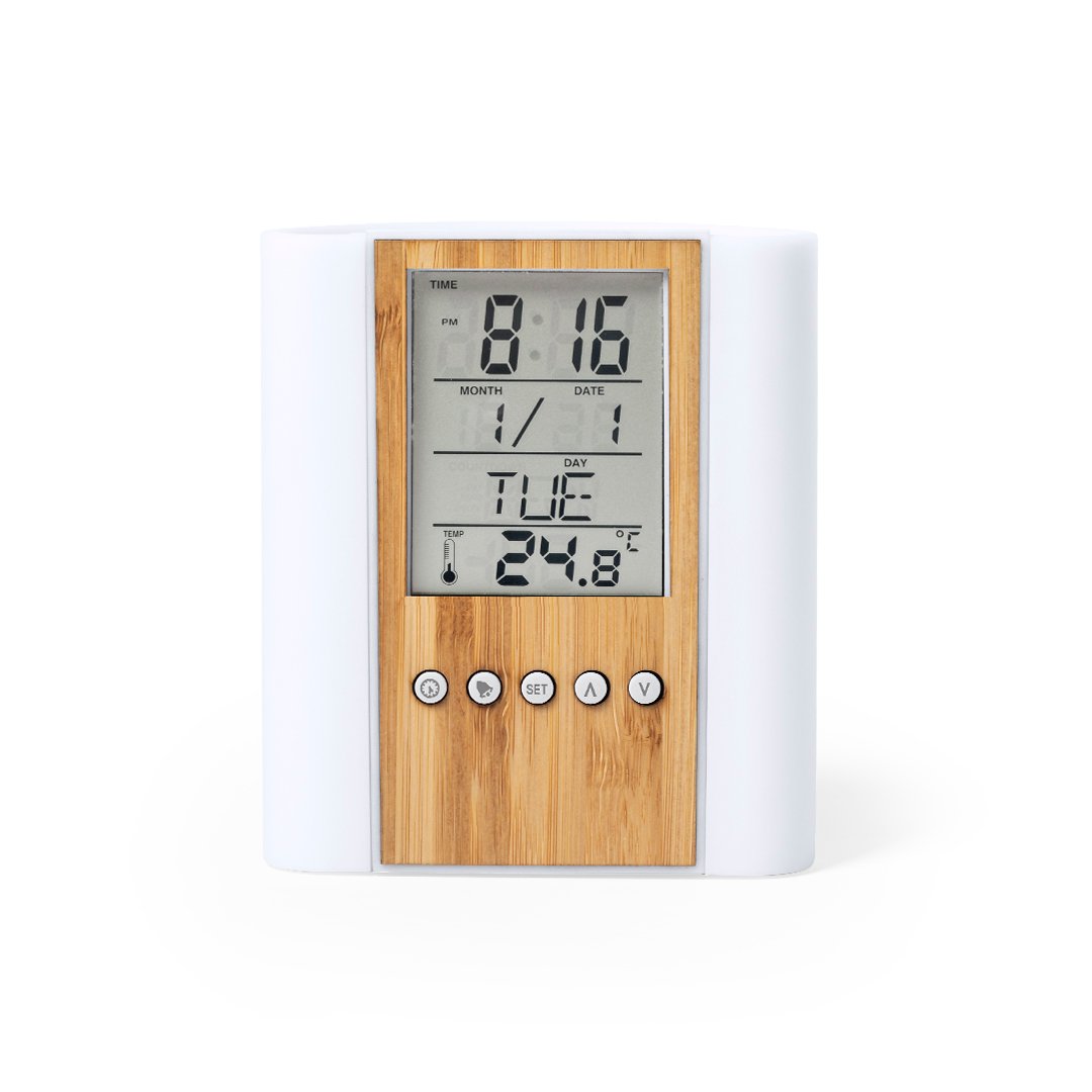 Stylo de ligne naturelle avec montre multifonction intégrée. Fabriqué en combinaison de bambou et de matériaux ABS. Thermomètre, calendrier et fonctions d’alarme minuterie et rappel d’anniversaire. Alimentation de la batterie (bouton inclus) et présenté dans une boîte de conception écologique attrayante. Le manuel d’instructions est disponible en espagnol et en anglais.