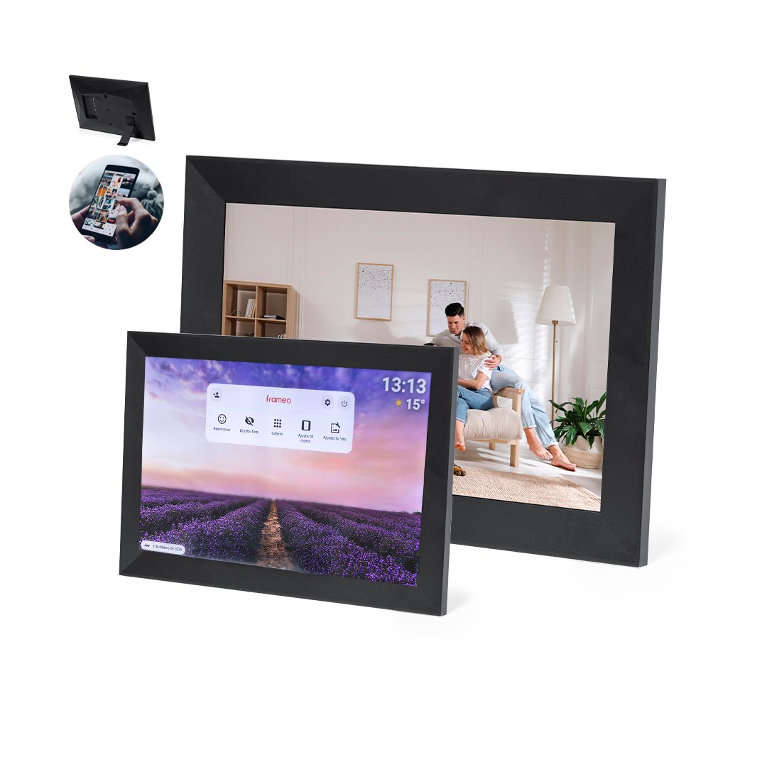 Cadre photo numérique de 10,1 pouces. Avec un écran tactile IPS haute résolution de 1280×800 pixels, une connectivité WiFi, et équipé de fonctionnalités intelligentes telles que l’affichage du temps, l’alarme et l’horloge. Il comprend également un menu pour explorer un monde de possibilités en regardant des vidéos, des photos et en écoutant de la musique, avec une option d’affichage horizontale et verticale. Avec support à l’arrière et des rainures à accrocher au mur. Alimentation CA 220V-240V, avec chargeur inclus. Présenté dans une boîte de conception kraft et disponible mode d’emploi en anglais et espagnol.