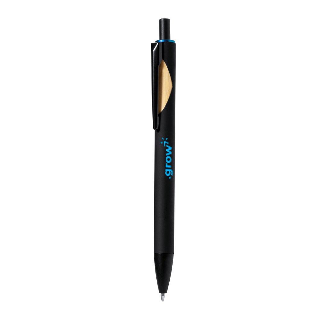 Stylo à bille à bouton-poussoir avec corps de finition solide en noir et détails supérieurs dans une gamme de couleurs variée. Clip métallique noir avec détail en bambou. Spécialement conçu pour le marquage laser et avec un revêtement extérieur spécial pour que votre publicité soit parfaitement gravée et assortie. Encre bleue. Présenté dans un sac individuel recyclé.Des matériaux tels que le bambou encouragent l’utilisation de matières premières naturelles en réduisant les émissions polluantes. Il provient d’une plante très résistante et polyvalente, avec une croissance et une régénération rapides, étant une excellente alternative à l’utilisation du bois traditionnel.