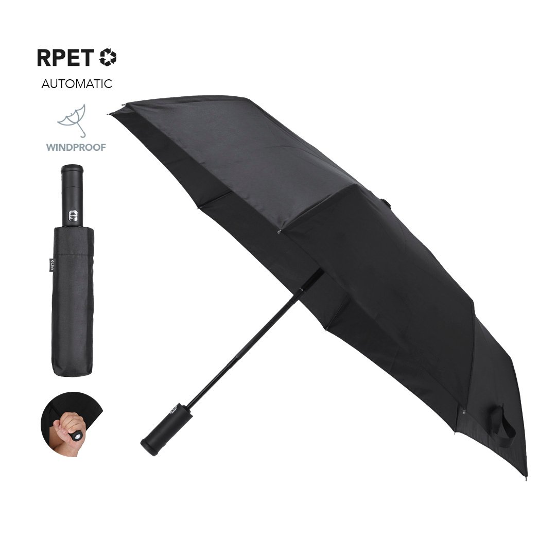 Parapluie en RPET. Avec une poignée lanterne pratique tournant à 180º en caoutchouc soft touch et bouton ON/OFF. Diamètre de 105 cm, en matériau pongé RPET 190T. Ouverture et fermeture automatiques, avec mécanisme coupe-vent et baleines en fibre de verre. Étiquette avec logo RPET. Alimentation par batterie (piles boutons incluses).Le matériau RPET est fabriqué à partir de plastique recyclé, favorisant ainsi la réutilisation des déchets plastiques et contribuant à la durabilité de la planète.