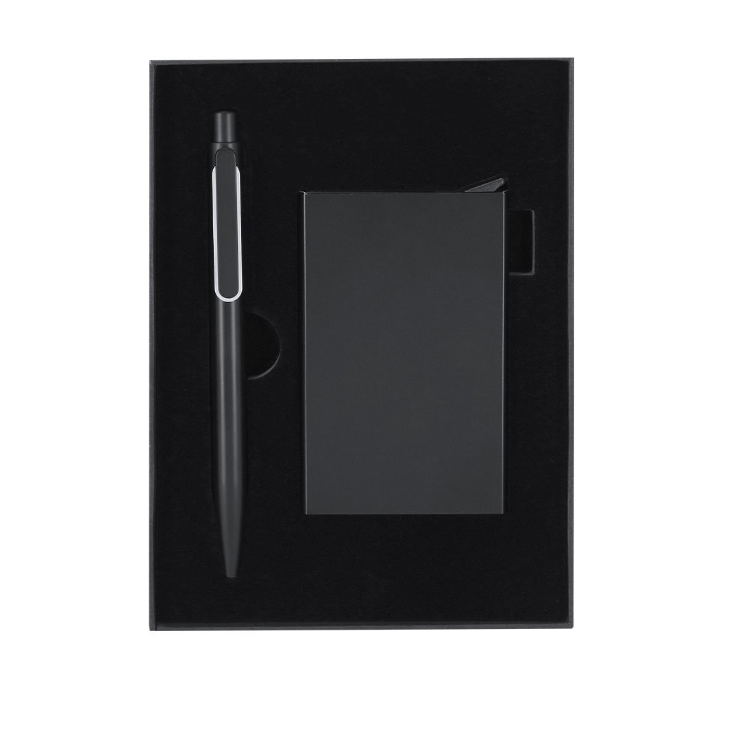 Set de stylo et porte-cartes fabriqués en Aluminium Recyclé.Le set comprend :- Stylo en noir mat fabriqué en Aluminium Recyclé à mécanisme à bouton avec clip et élément décoratif en métal poli. – Porte-cartes en noir fabriqué en Aluminium Recyclé pouvant contenir 6 cartes avec RFID et mécanisme à bouton pour extraire les cartes.Les deux avec logo en Aluminium Recyclé gravé et présentés dans une élégante boîte noire avec intérieur découpé.L’Aluminium Recyclé est un matériau avec des possibilités de recyclage presque infinies, sans perdre ses propriétés originales et consommant moins d’énergie dans ce processus.Certification GRS (Global Recycled Standard / Standard de Recyclage Global), qui garantit l’origine recyclée du matériau utilisé pour fabriquer le produit.