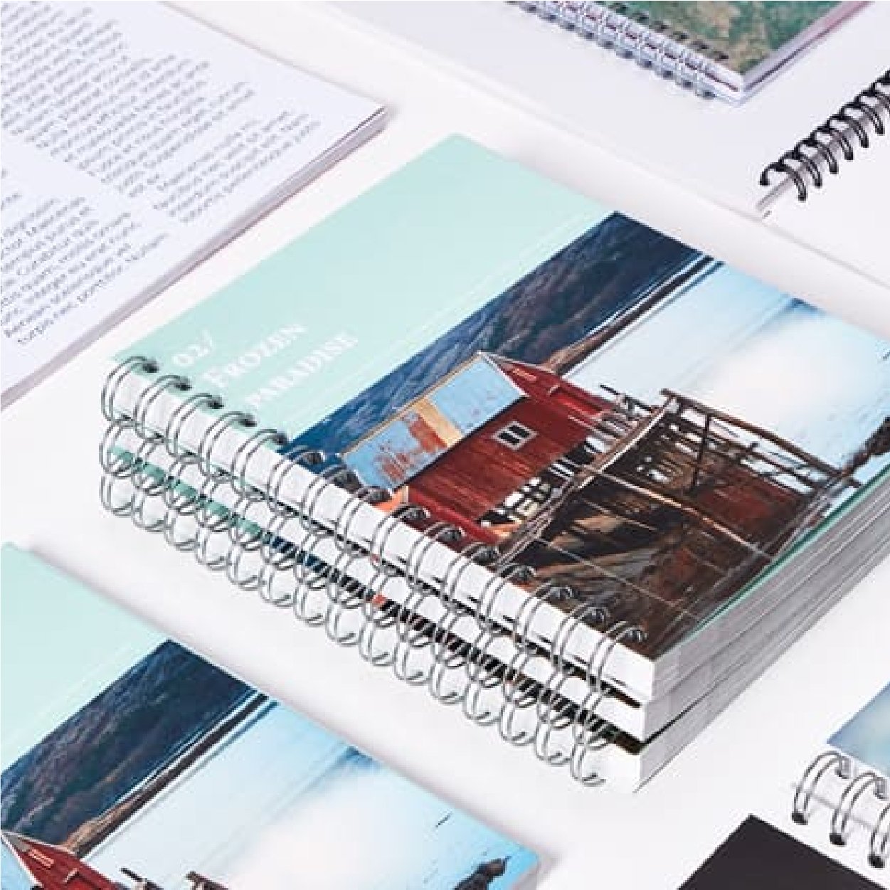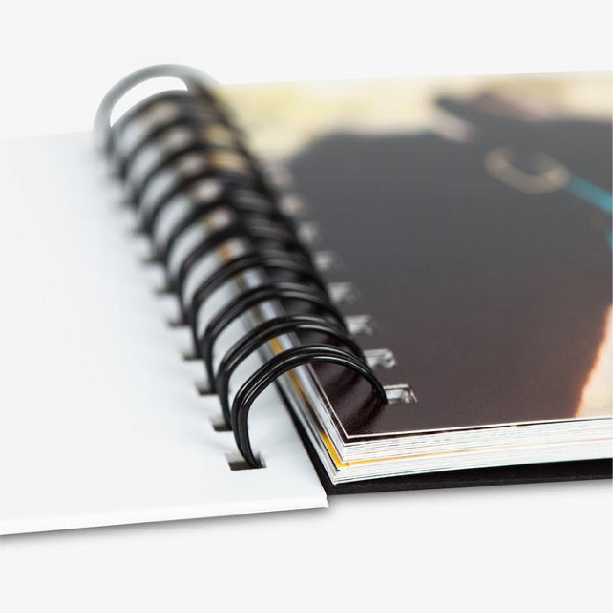 Pour ce produit, nous avons besoin que tous les textes et images importantes soient à au moins 11 mm de la spirale. Cela signifie que vous devez envoyer vos visuels avec une marge de 11 mm à gauche pour les pages impaires et de 11 mm à droite pour les pages paires. Pour le haut, le bas et le côté opposé de la spirale, conservez tous les textes et images importantes à au moins 4 mm du bord du format final.