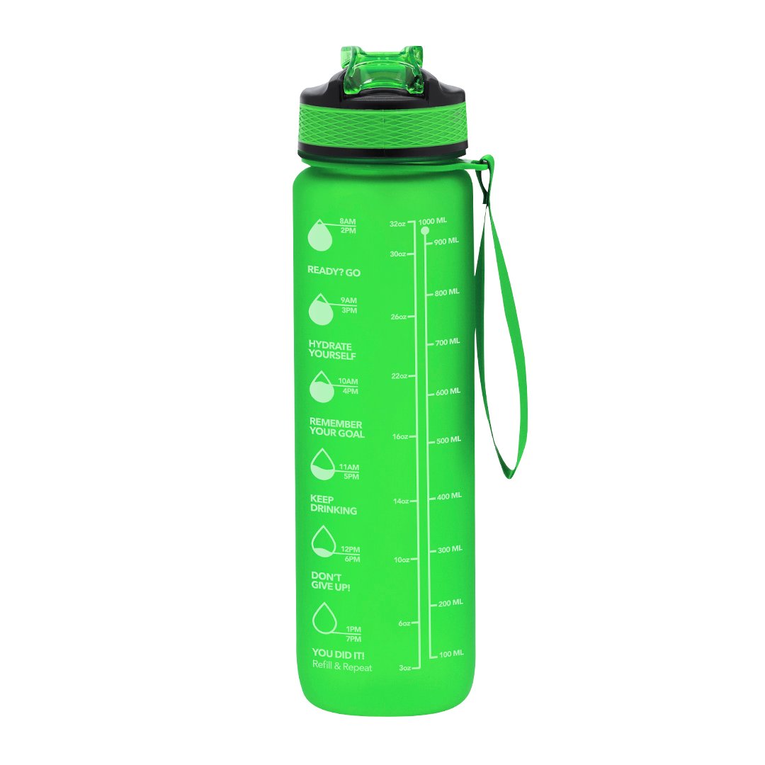 Bouteille d’une capacité de 1L, fabriquée en PETG durable, avec une finition mate translucide. Avec indicateur de capacité en litres et en onces, ainsi que des phrases motivantes qui vous invitent à bien vous hydrater. Avec bouchon à vis noir. Inclut un distributeur avec verrou de sécurité et une sangle de transport confortable. Sans BPA.