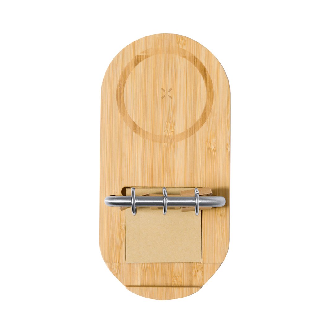 Chargeur multifonction sans fil 15W fabriqué en bambou. Il comprend un support pour smartphone et un calendrier perpétuel, ainsi qu’un bloc-notes avec 50 notes adhésives kraft de 4,5×4,5 cm. Sortie USB et entrée et sortie Type C, permettant de charger simultanément jusqu’à 3 périphériques (1 par chargement sans fil, 1 par câble Type C et 1 par câble USB). Compatible avec les périphériques équipés de la technologie de chargement sans fil. Vaste surface de marquage et présenté dans une boîte individuelle de conception kraft.Des matériaux comme le bambou favorisent l’utilisation de matières premières naturelles et réduisent les émissions polluantes. Il est issu d’une plante très résistante et polyvalente, avec une croissance et une régénération rapides, ce qui est une excellente alternative à l’utilisation du bois traditionnel.Fabriqué conformément aux normes RoHS et aux exigences de sécurité suivantes :Protection contre la surchauffe.Système de protection contre la surcharge.Système de verrouillage pour éviter les courts-circuits.