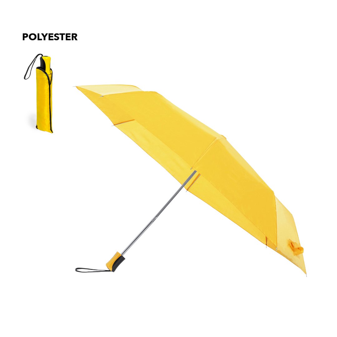 Parapluie pliant 8 panneaux en polyester 190T. Ouverture manuelle, avec tiges en métal argenté et fermeture velcro. Poignée ergonomique avec sangle de transport et housse de protection assortie. Disponible dans une large gamme de couleurs. Présenté dans un sac recyclé individuel.
