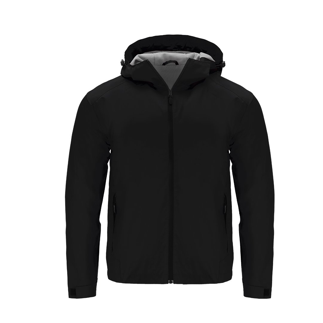 Parka unisexe avec capuche, imperméable et coupe-vent. Doublure intérieure en maille grise foncée, avec capuche réglable à cordon noir et œillets métalliques assortis. Fermeture à glissière inversée à l’avant en noir, avec tirette assortie. Deux poches latérales avec zip noir, tirettes assorties et une poche intérieure. Poignets réglables avec velcro noir.