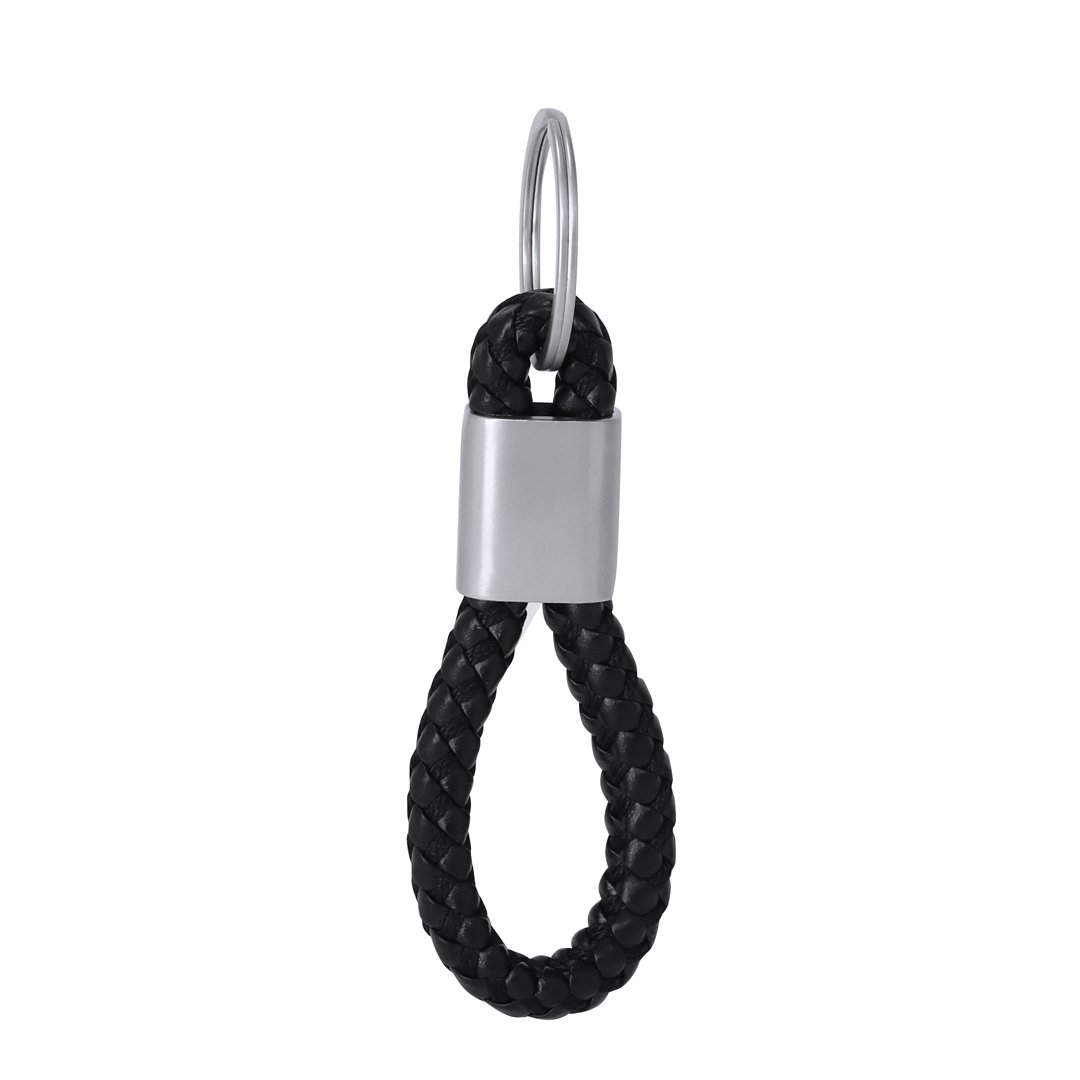 Porte-clés élégant avec cordon en cuir PU tressé. Comprend une pièce centrale en alliage mat, spécialement conçue pour le marquage laser.