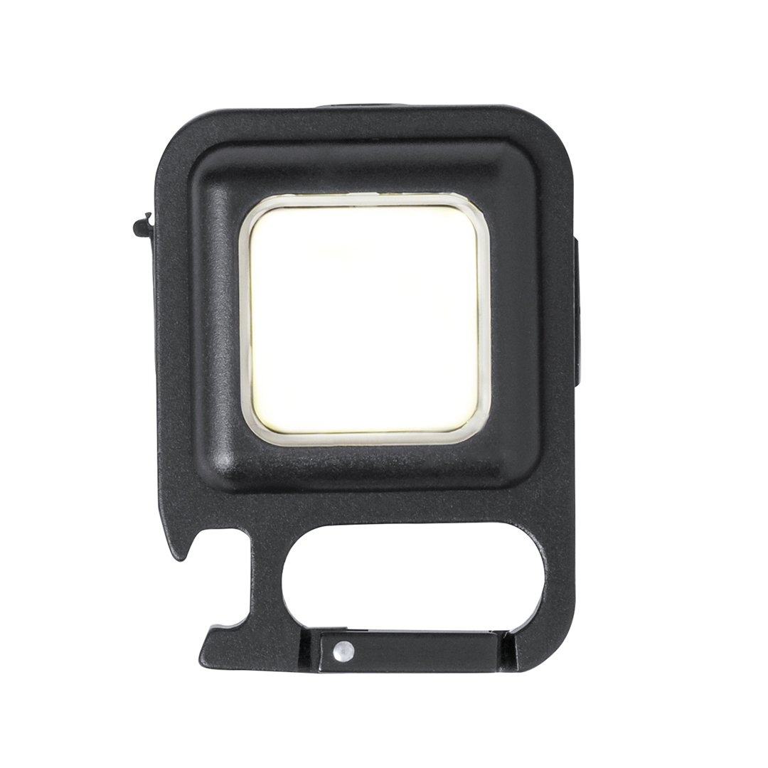 Lanterne d’ouverture puissante fabriquée en abs robuste et 30 lumières COB, avec trois positions de lumière (fixe et clignotante à deux vitesses). Comprend un mousqueton pour le transport facile, un support arrière de soutien, des ouvre-bouteilles et un aimant puissant. Rechargeable, avec batterie de 300 mAh. Câble inclus et manuel en anglais et espagnol. Présentée individuellement dans la boîte design.