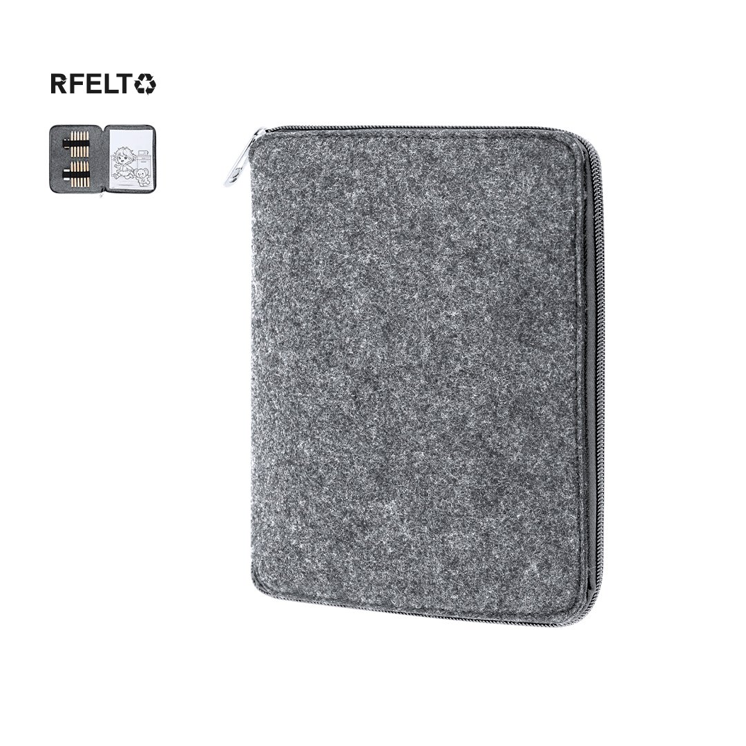 Set de crayons de couleur dans une trousse fabriquée en feutre RPET. Inclut 11 crayons de couleurs hexagonales, 1 gomme à effacer, 1 taille-crayon en bois et 60 feuilles avec des designs amusants en noir et blanc à colorier. Présenté dans une trousse pratique avec fermeture éclair en bicolore et intérieur avec des bandes élastiques pour organiser les accessoires. Avec label RPET.Le feutre RPET est le résultat de la combinaison du processus de recyclage des matériaux plastiques avec la technique millénaire de fabrication du feutre, donnant ainsi un matériau éco-tendance qui, en plus d’être d’origine recyclée, est également recyclable.