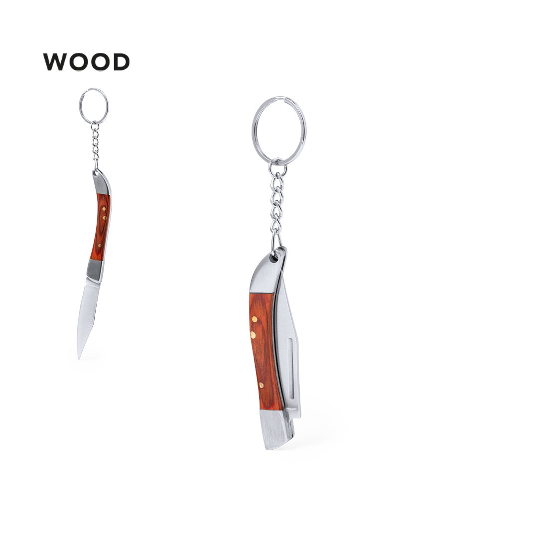 Porte-clés canif pratique avec lame en acier inox et poignée métallique robuste avec détails en bois naturel. Présenté dans une boîte de conception kraft.