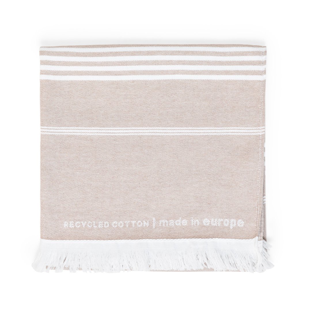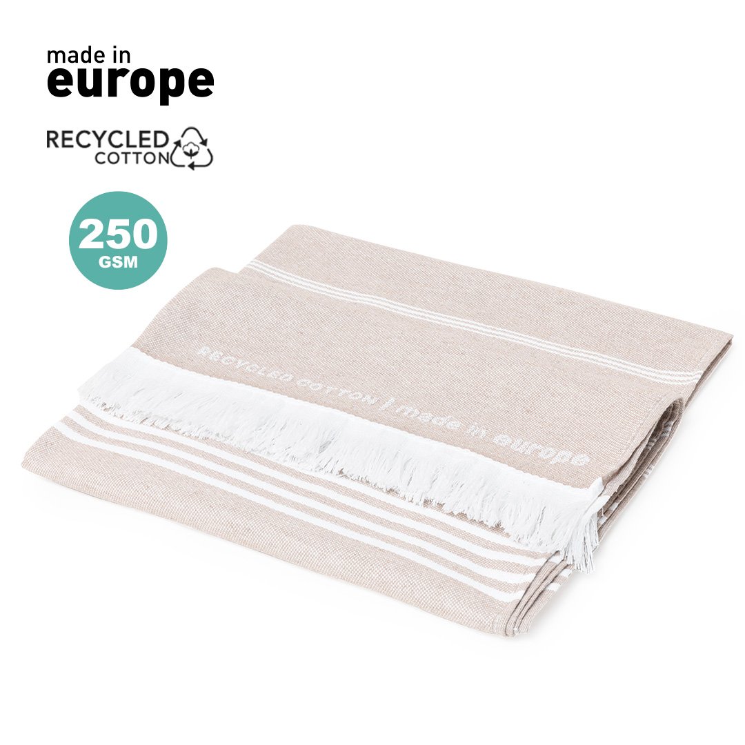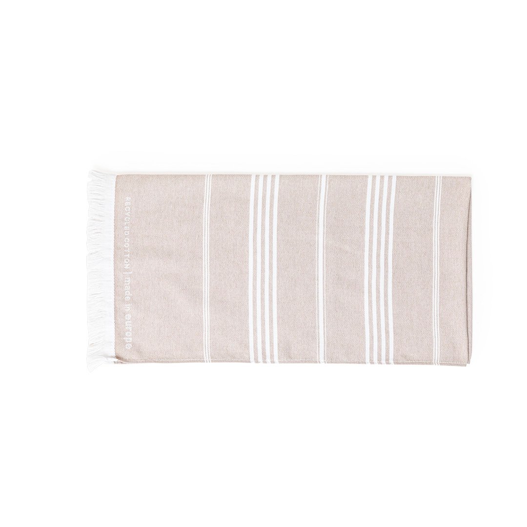 Serviette Pareo 2 en 1 de la ligne nature et finition couleur terre. De fabrication européenne et en combinaison de coton recyclé et de polyester de 250g/m2. Avec la certification GRS (Global Recycled Standard) qui accrédite l’origine recyclée du matériau utilisé dans la fabrication du produit. Taille 150 x 80 cm.