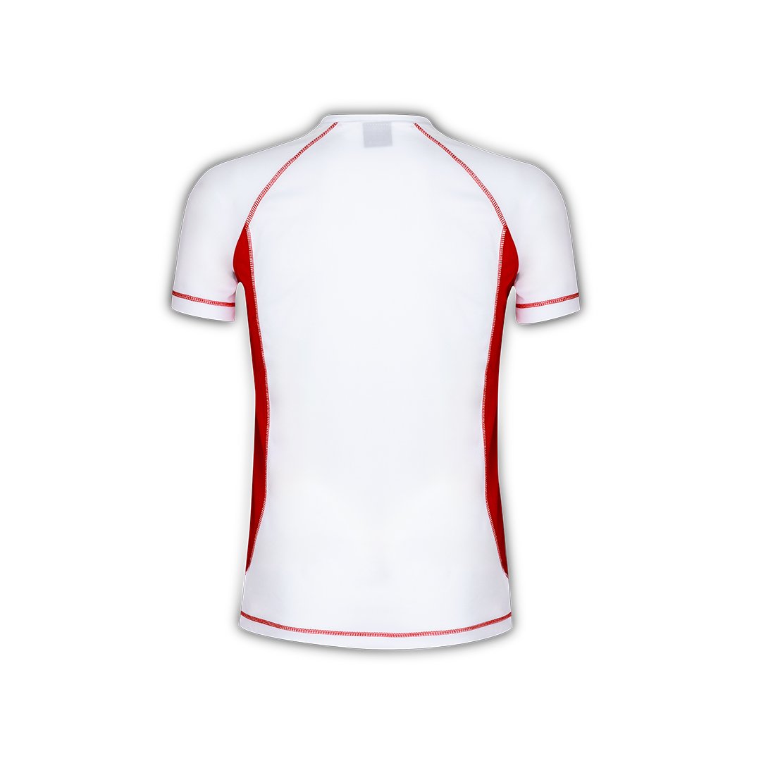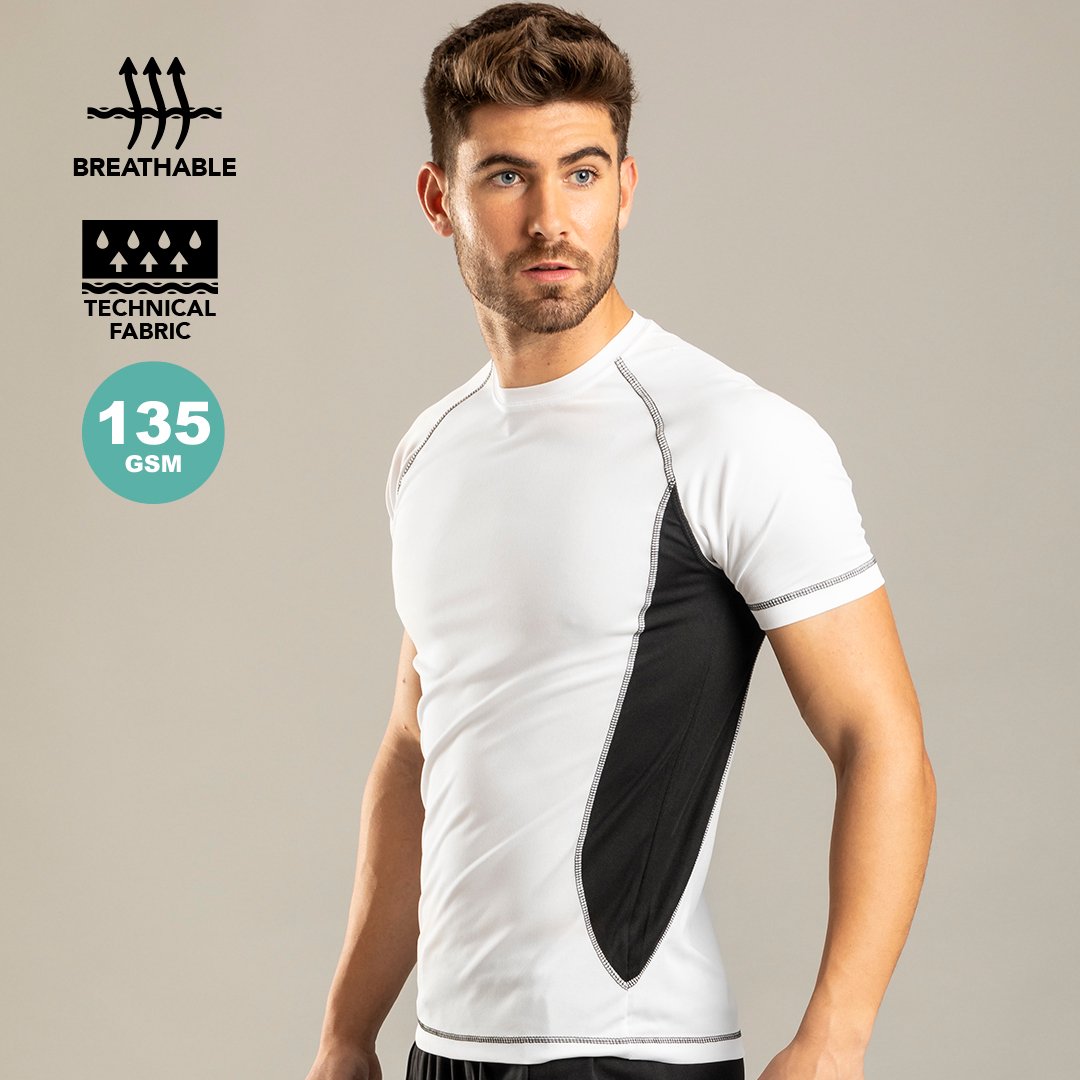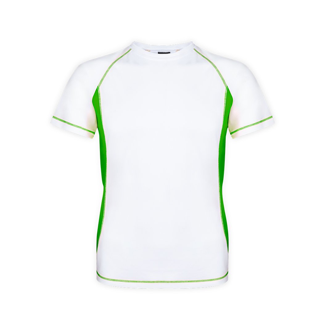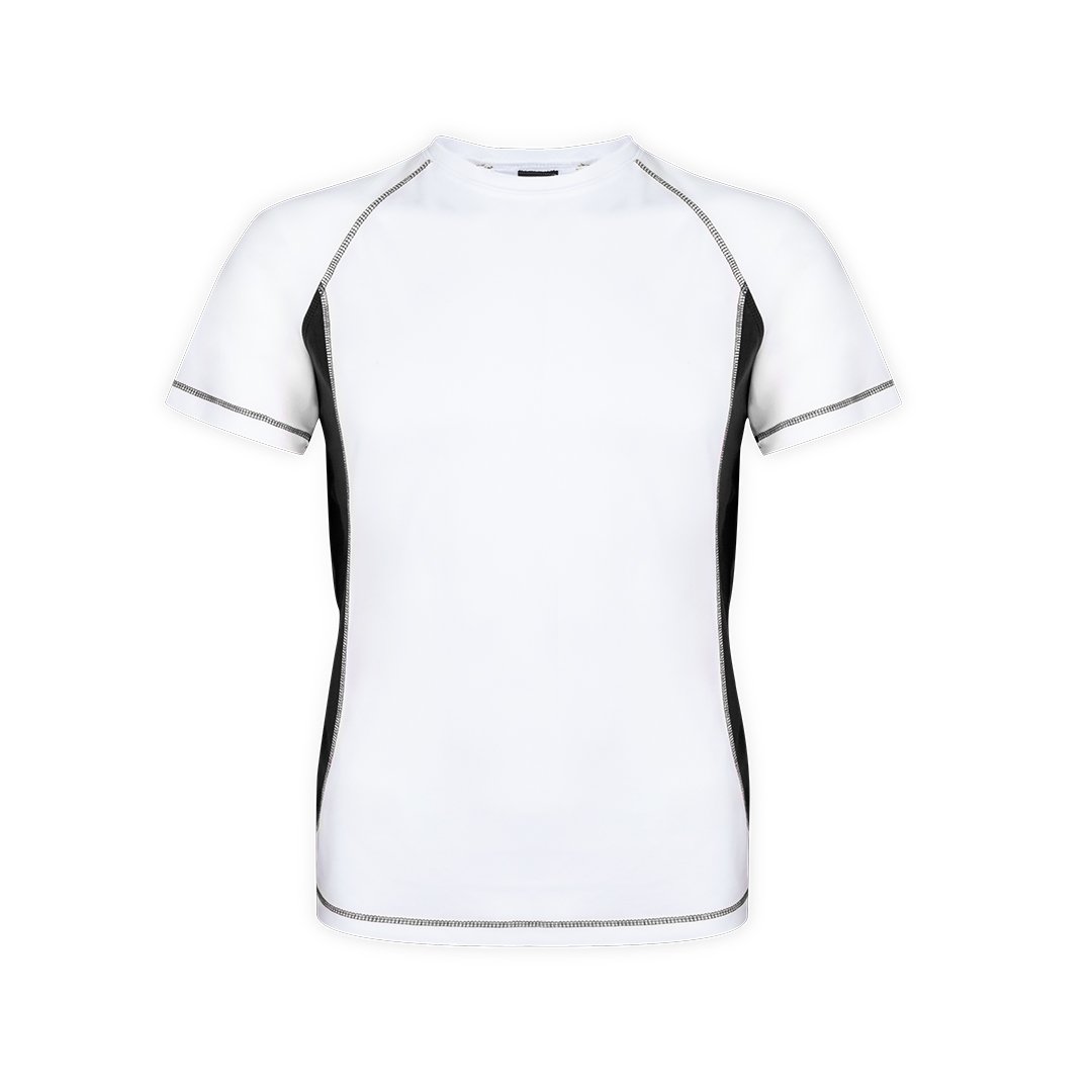 T-shirt technique pour adultes en 100% polyester respirant 135g/m2. Blanc avec coutures de renfort et côtés en couleurs vives. Disponible en tailles S, M, L, XL, XXL.