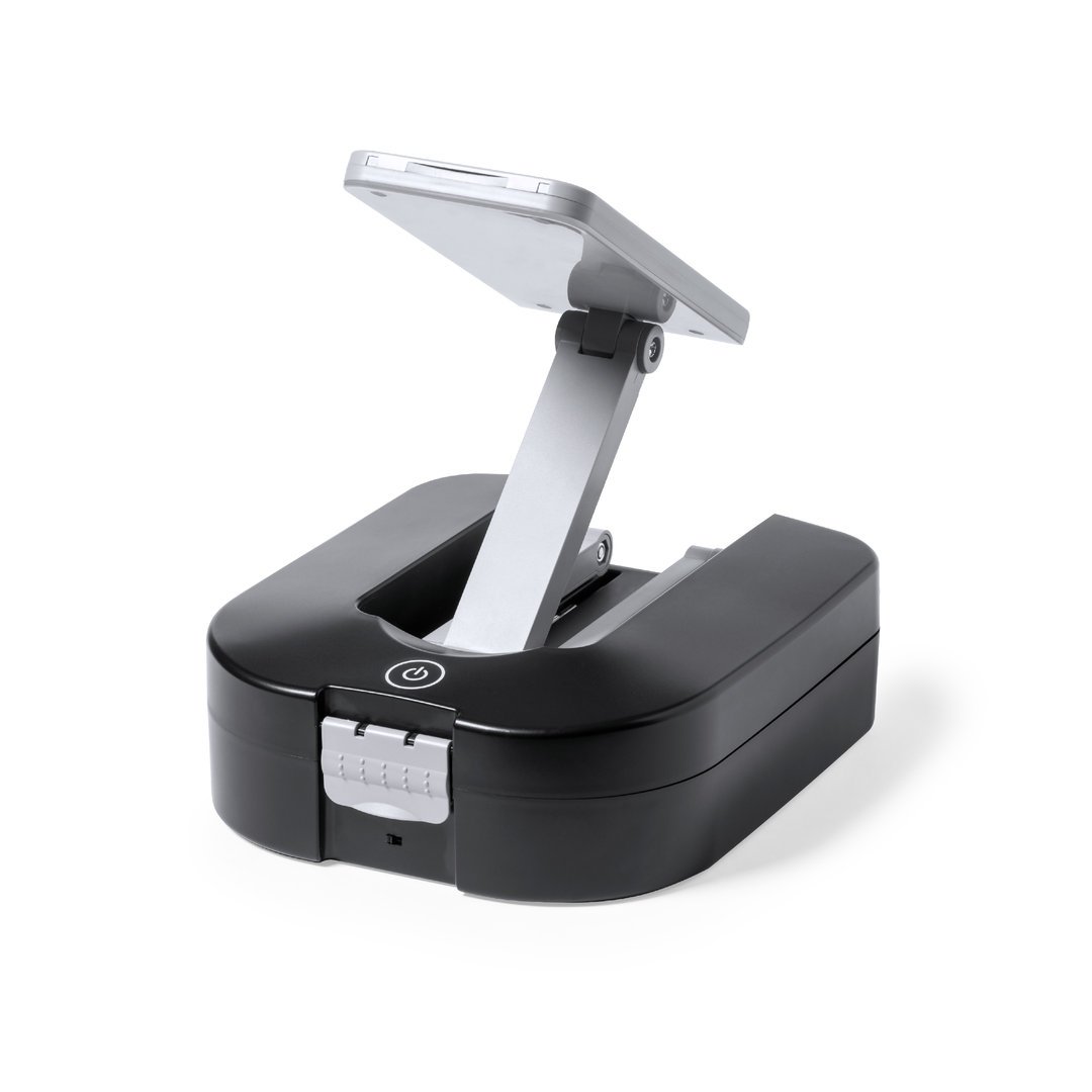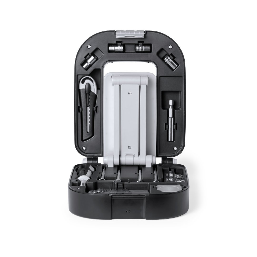 Ensemble original d’outils avec lumière et 30 accessoires. Présenté dans un coffret en ABS noir résistant avec serrure. Lampe pliante intégrée au boîtier, avec 24 LED et bouton ON/OFF. Comprend un tournevis avec une multitude d’embouts plats, philips, torx… Avec un kit de tournevis de précision clés à tube et clés Allen de différentes tailles cutter et flexomètre 1m. Lampe à piles (3xAA non incluses). Présenté dans une boîte design kraft individuelle.