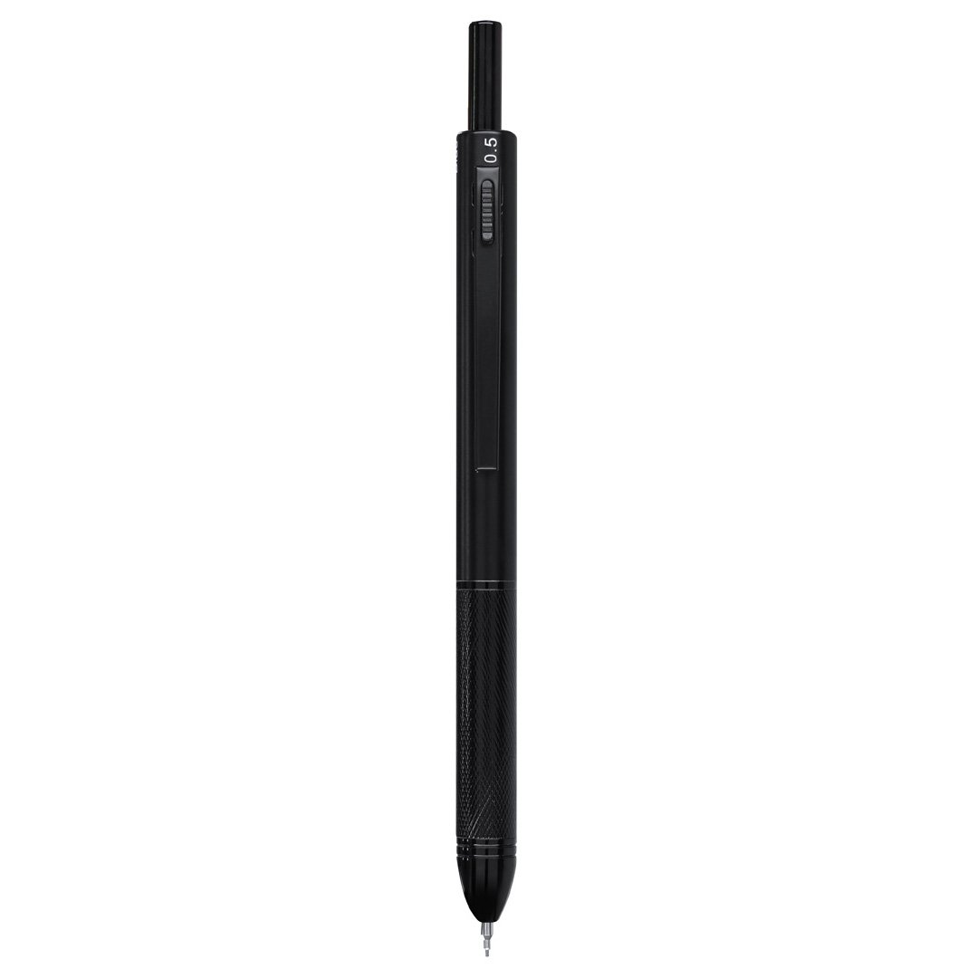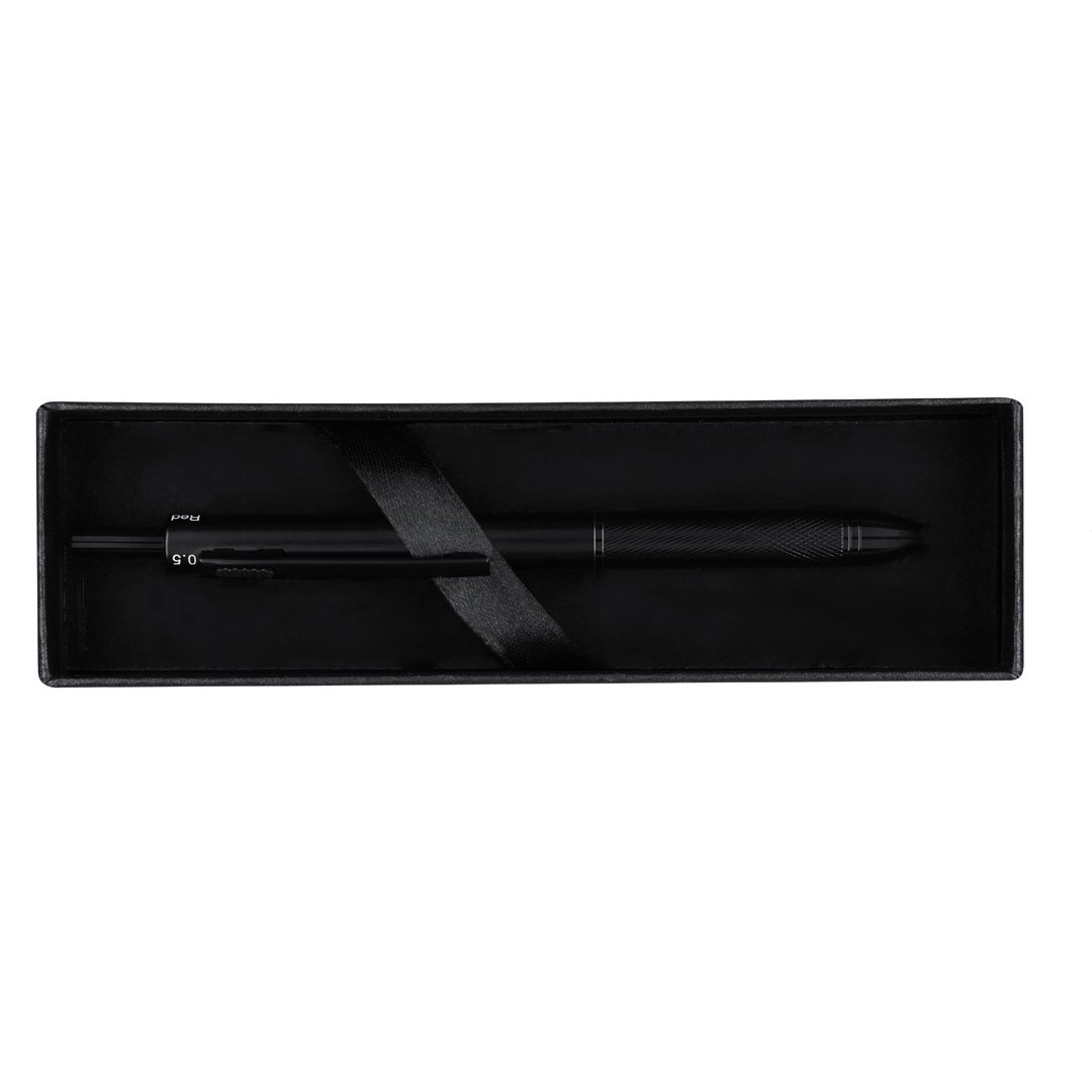 Stylo 4-en-1 et porte-mine en aluminium résistant, avec un mécanisme intelligent permettant de sélectionner la couleur de l’encre ou le crayon. Options d’encre bleue, noire et rouge et fonction porte-mine. Comprend une mine de 0,5 mm, avec une gomme intégrée dans le bouton-poussoir. Prise ergonomique et clip de couleur assortie.