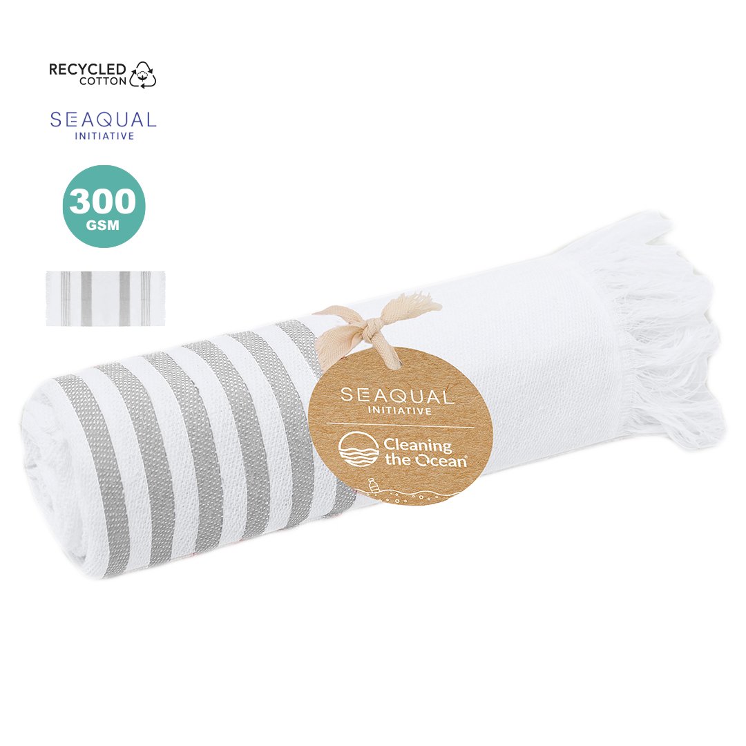 Pareo-serviette doux de 300 g/m², confectionné dans une combinaison de coton recyclé et polyester recyclé SEAQUAL.Son design présente une base blanche combinée avec des rayures colorées et est décoré par de magnifiques franges aux extrémités. Inclut une étiquette avec un design SEAQUAL, qui certifie son origine durable et sa contribution à la nettoyage des océans. SEAQUAL INITIATIVE travaille avec des partenaires et des autorités pour aider à nettoyer nos océans. Les déchets marins de nos plages, fonds et surfaces océaniques, rivières et estuaires sont collectés par des programmes de nettoyage. Ils sont ensuite triés par types de matériaux et la portion de plastique est nettoyée et transformée en PLASTIQUE MARIN RECYCLÉ, une matière première complètement traçable qui crée des produits durables et inspirants. En choisissant des produits contenant du PLASTIQUE MARIN RECYCLÉ, vous aidez à nettoyer nos océans.ENSEMBLE POUR UN OCÉAN PROPRE.