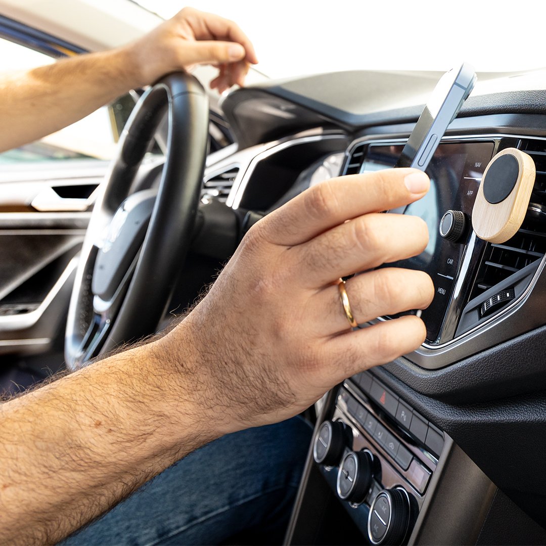 Support de voiture pour smartphone en bambou. Fixation magnétique confortable et sécurisée. Comprend un anneau adhésif. Présenté dans un coffret individuel éco-conçu en carton kraft.Des matériaux comme le bambou encouragent l’utilisation de matières premières naturelles, réduisant les émissions polluantes. Il provient d’une plante très résistante, à croissance polyvalente et à régénération rapide, constituant une excellente alternative à l’utilisation du bois traditionnel.