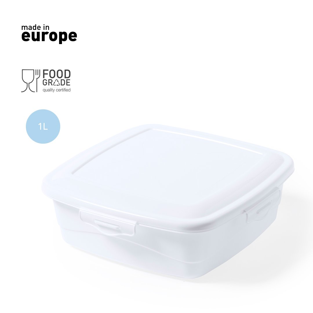 Boîte à lunch d’une capacité de 1L, en PP blanc. De fabrication européenne et avec certification Food Grade, garantissant la sécurité lorsque les aliments entrent en contact avec le matériau utilisé pour fabriquer le produit. Format carré, avec fermeture de sécurité de tous les côtés.