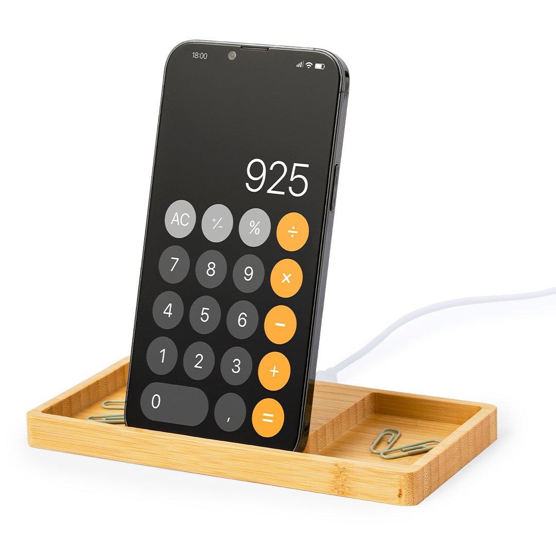 Chargeur organisateur sans fil 15W fabriqué en bambou. Compatible avec la fonctionnalité smartphone et les compartiments d’objets supplémentaires, compatible avec les périphériques équipés de la technologie de chargement sans fil. Grande surface de marquage et présenté dans une boîte individuelle de conception kraft. Le mode d’emploi est disponible en anglais et espagnol.Des matériaux comme le bambou favorisent l’utilisation de matières premières naturelles et réduisent les émissions polluantes. Il est issu d’une plante très résistante et polyvalente, avec une croissance et une régénération rapides, ce qui est une excellente alternative à l’utilisation du bois traditionnel.Fabriqué conformément aux normes RoHS et aux exigences de sécurité suivantes :Protection contre la surchauffe.Système de protection contre la surcharge.Système de verrouillage pour éviter les courts-circuits.